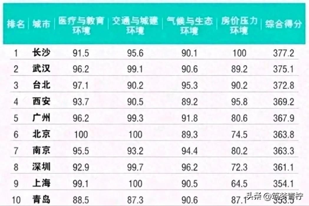 值得一提的是,这份榜单的评价体系除了对城市的硬件设施进行考量外,还十分注重城市的软环境,如医疗与教育环境的优化程度、交通与城建环境的便捷程度、气候与生态环境的舒适程度以及房价压力的合理程度等。这也是对城市居民生活质量的重要体现。