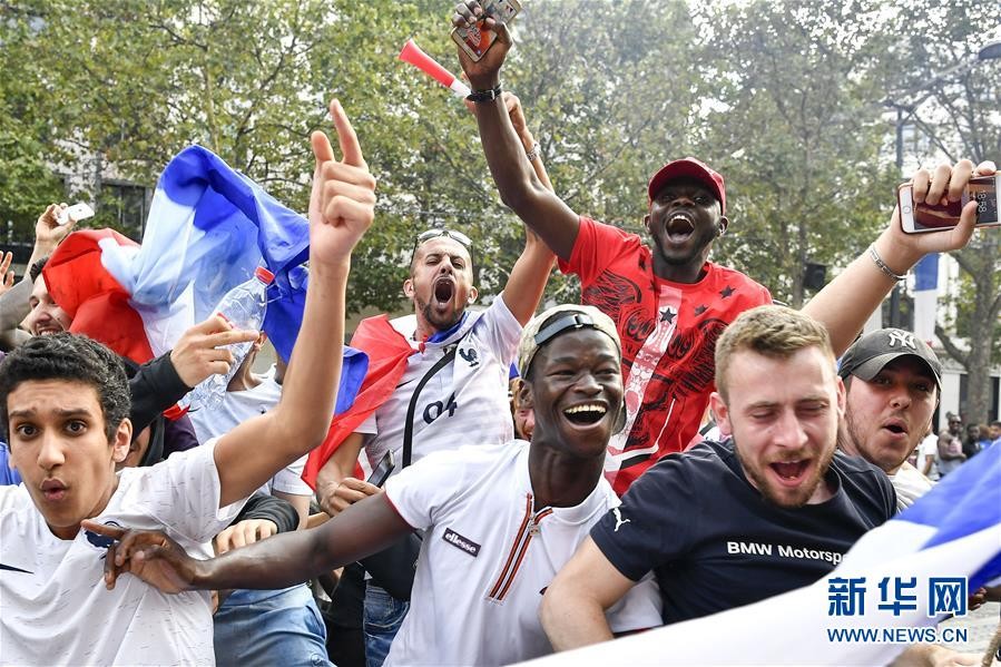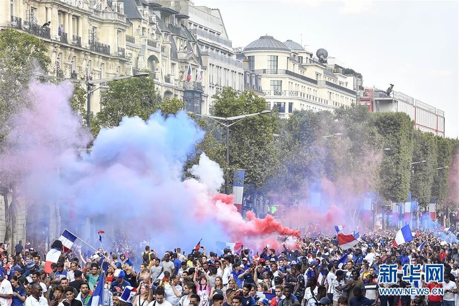 7月15日,法国球迷在巴黎香榭丽舍大街上庆祝法国队夺冠。