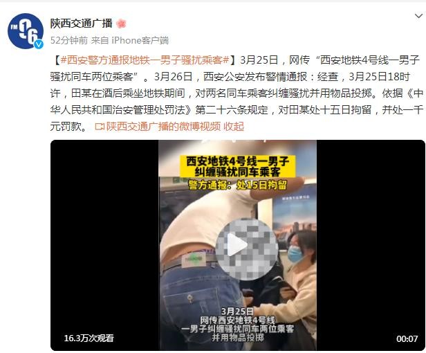 3月25日,网传“西安地铁4号线一男子骚扰同车两位乘客”。3月26日,西安公安发布警情通报:经查,3月25日18时许,田某在酒后乘坐地铁期间,对两名同车乘客纠缠骚扰并用物品投掷。依据《中华人民共和国治安管理处罚法》第二十六条规定,对田某处十五日拘留,并处一千元罚款。