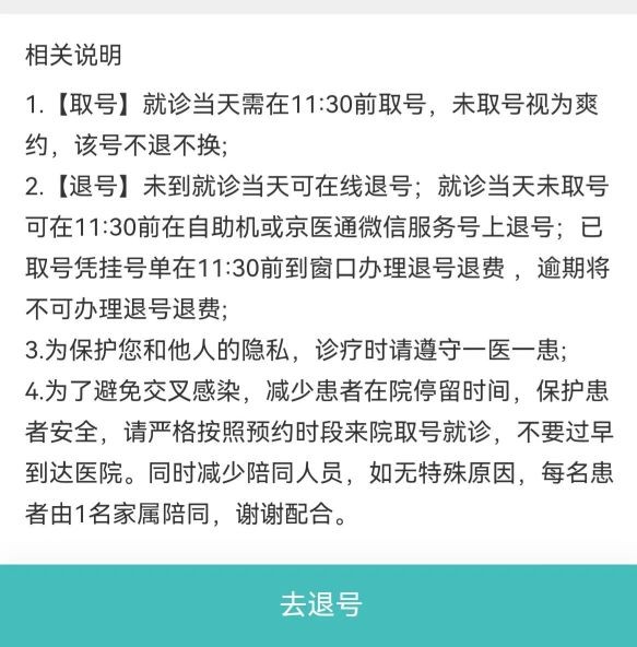 但要注意,如果未能就诊,一定要记得退号,记得退号,记得退号,(重要的事情说三遍)否则会被拉入黑名单,三次爽约,91天内将无法使用微信挂号。