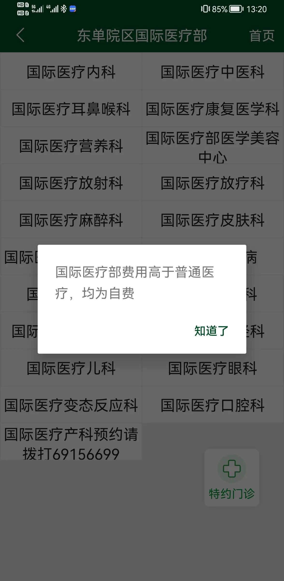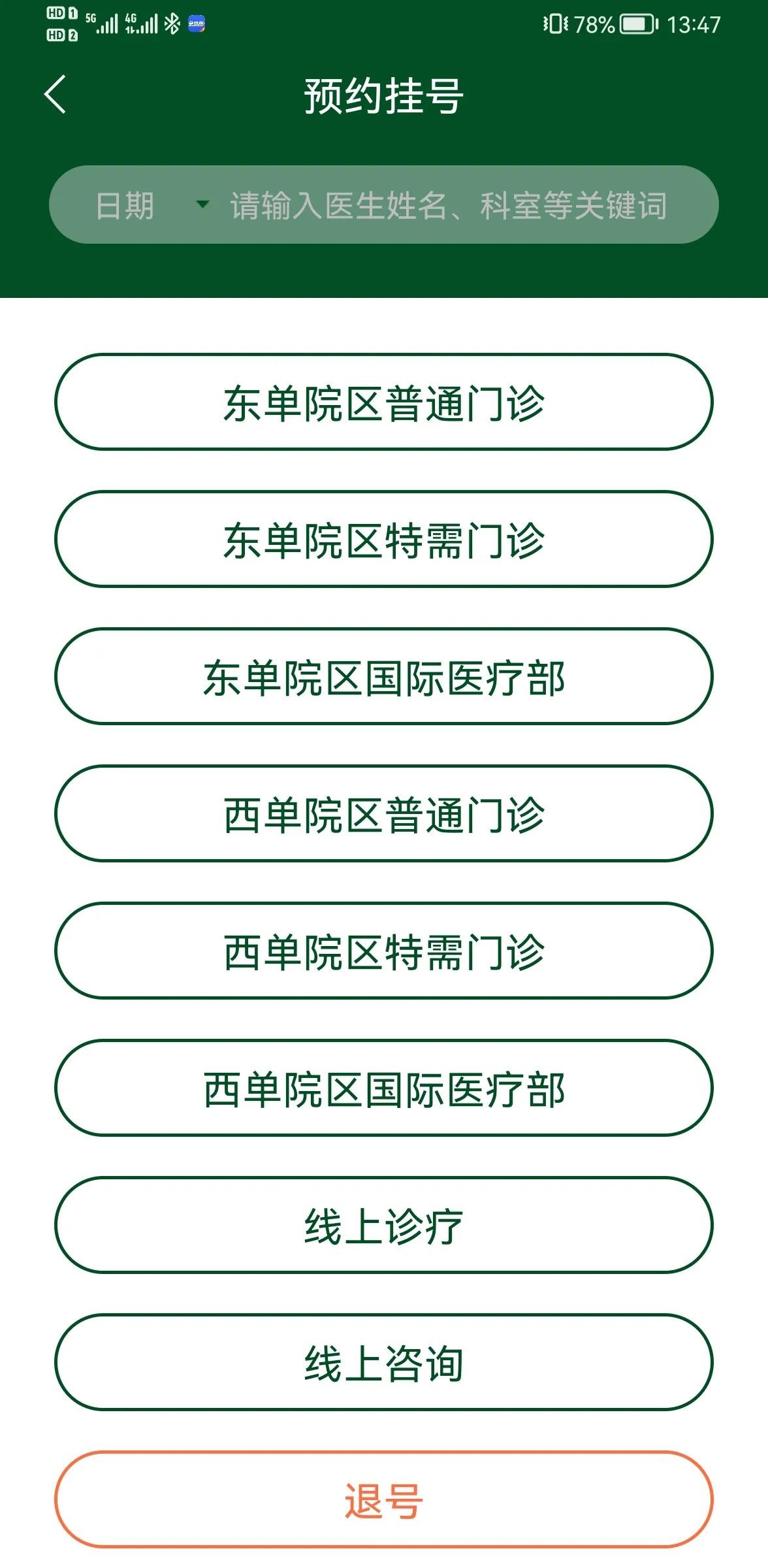 点击预约挂号,选择院区,注意普通门诊和特需及国际医疗收费是不同的。