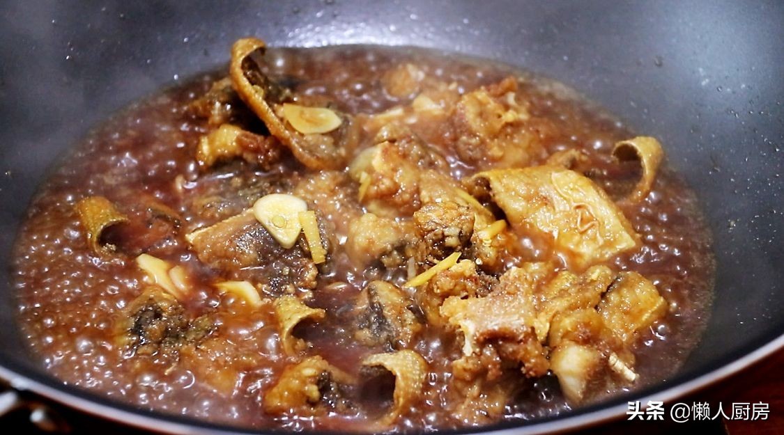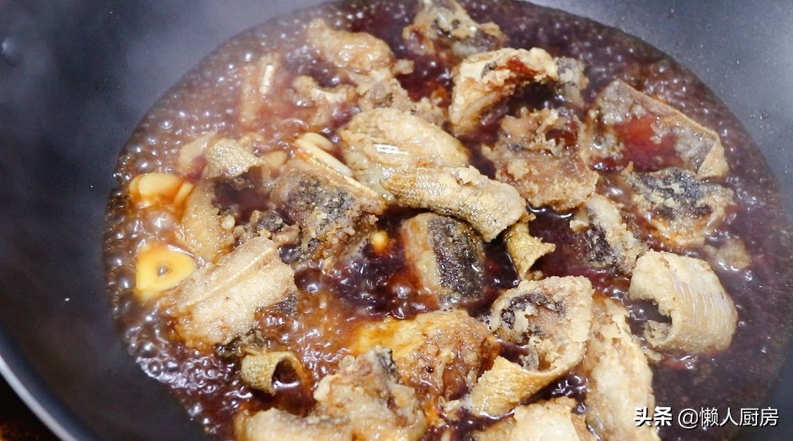 等锅内烧沸后,将炸好的鱼块倒入锅内煮制,倒入一些醋调味。