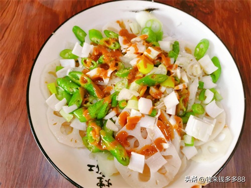 把藕削皮后,清洗干净,切薄片,大葱清洗干净后,切粒,大蒜清洗干净后,拍碎即可,青椒清洗干净后,切粒,所有食材准备好之后备用,锅中放水,水开后,放入莲藕片,绰至断生,捞出控水,放入盘中,加入大葱、大蒜、青椒,加入各种调味料,一起搅拌均匀即可,这样一道简单又美味的,凉拌菜就做好了,芝麻酱的香味,搭配上莲藕的脆爽可口,给人整个香迷糊了。