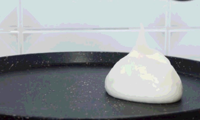 第五:搅拌成挂壁状,平底锅中浇灌油,浇灌一勺鸡蛋糕糊糊在平底锅中,小火煎炸