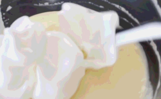 第四:搅拌成粘稠的蛋清液糊糊状,挖入蛋黄液中,用铲子翻拌均匀