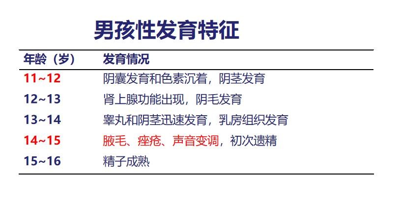 男孩进入青春期的标志是:睾丸开始发育。睾丸容积>4ml,家长可以找一个一元硬币大小对比。而一旦男孩开始变声,标志青春期进入尾声。具体发育时间请看下图。