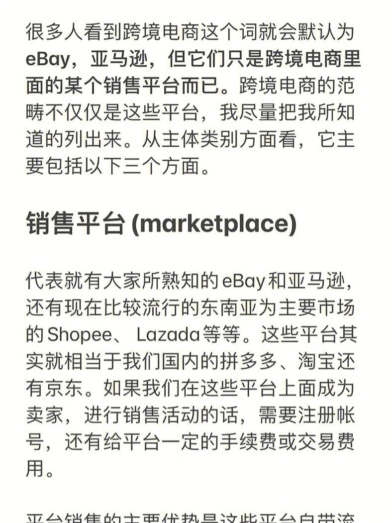 很多人看到跨境电商就理解为通过平台(eBay Amazon shopee速卖通等)把货物卖到国外去,或者把国外的产品卖到国内来。