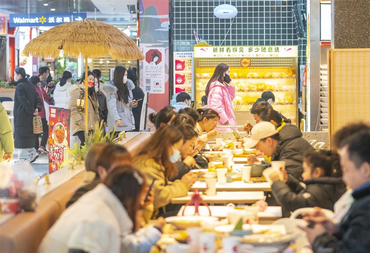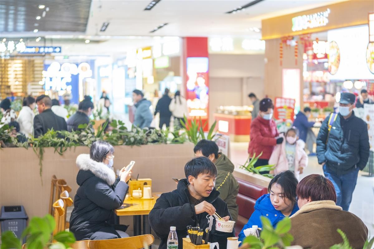 2月9日晚间时段,位于汉阳王家湾核心商圈的武汉摩尔城,顾客人流涌动,餐饮、零售、娱乐业态催旺“烟火气”。