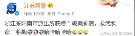 20日,江苏网警晒照:浙江东阳南市派出所获赠“破案神速,救我狗命”锦旗。