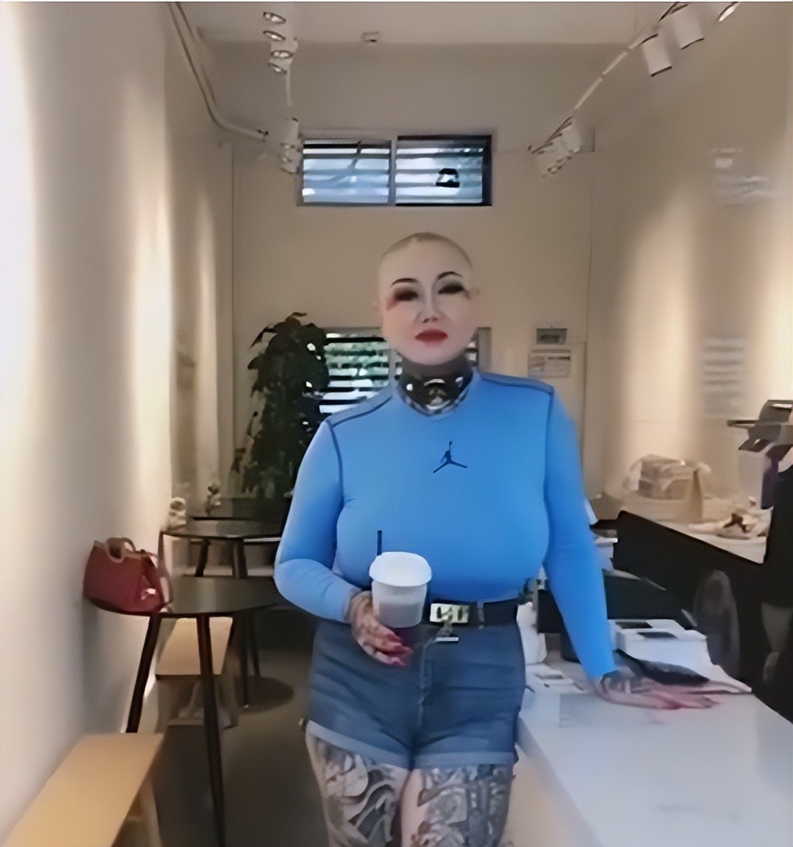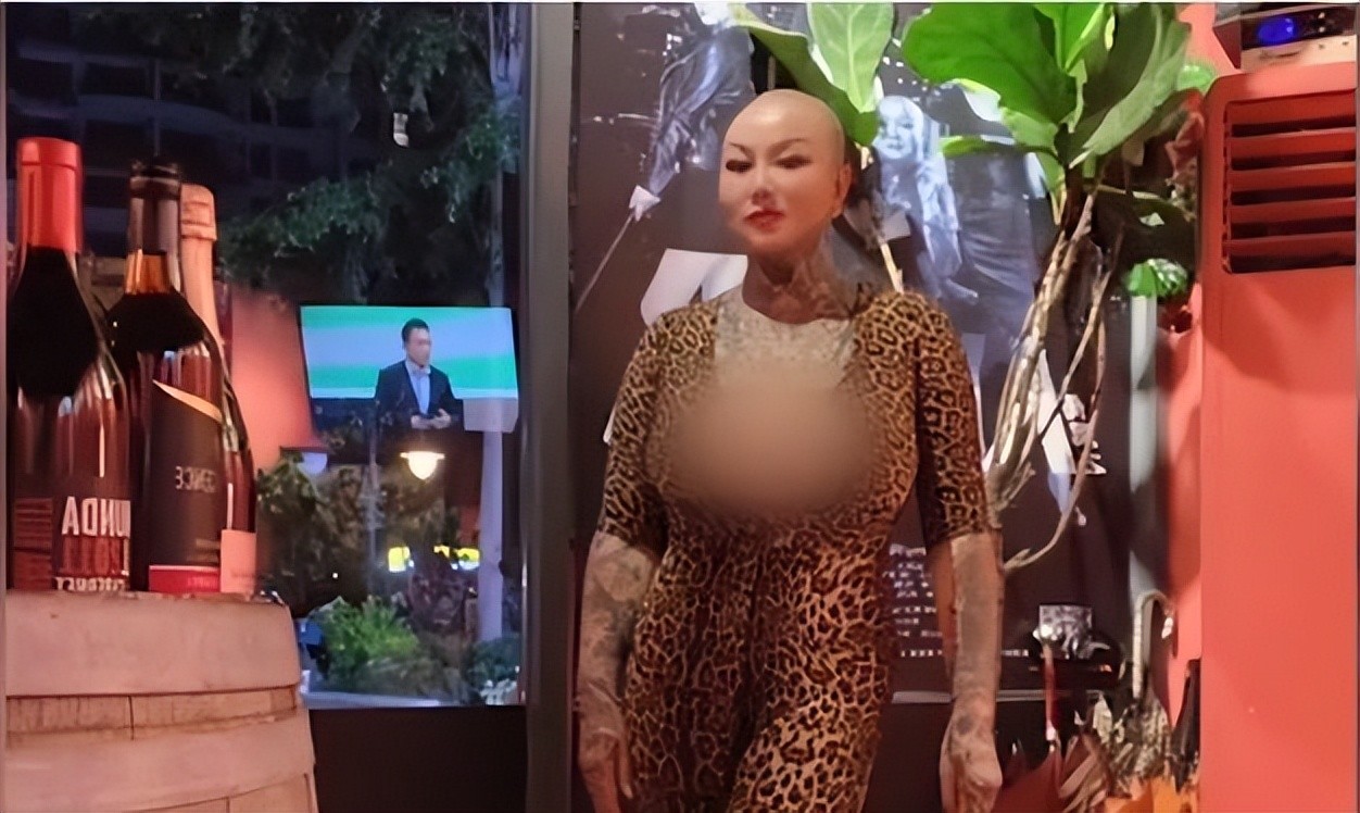 当光头巨乳,豹纹黑丝裹身,浓浓烟熏妆,犹如黑社会大姐大的冯萍,彪悍地出现在网友眼前。