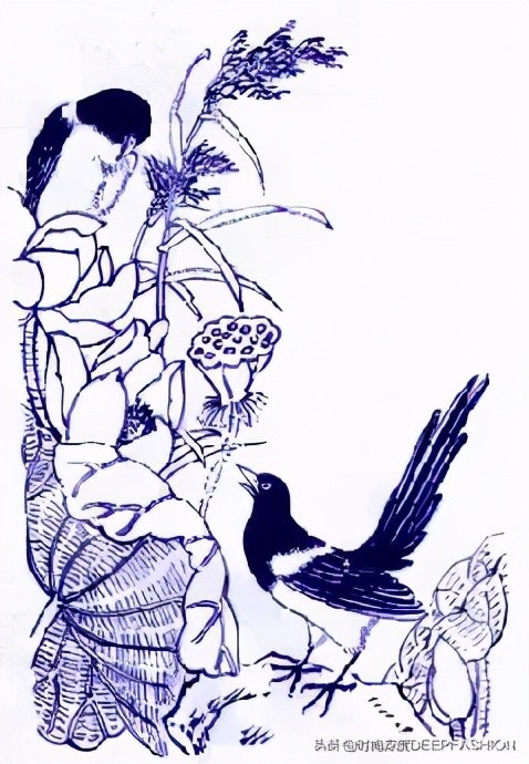 青花纹样多以动植物、人物、山水为主造型,韵味十足,有时勾画细致入微,有时呈现大写意风格。