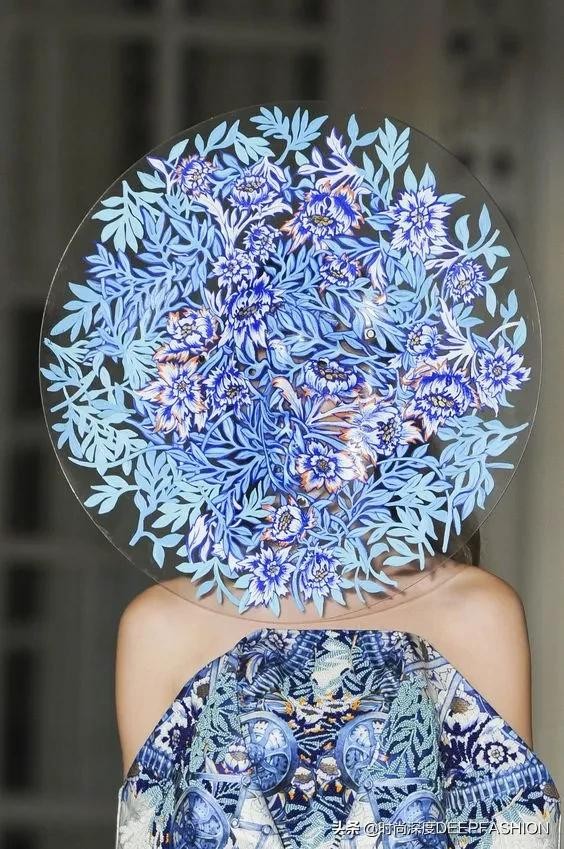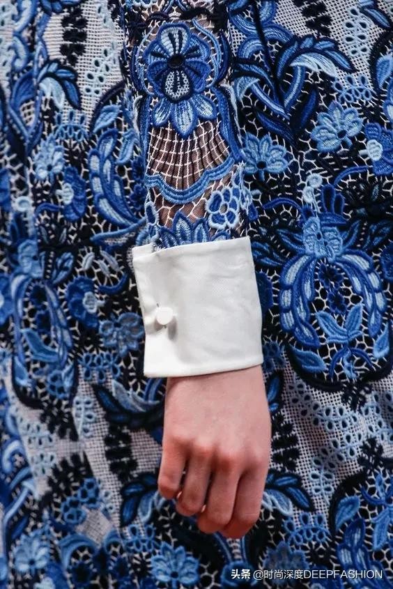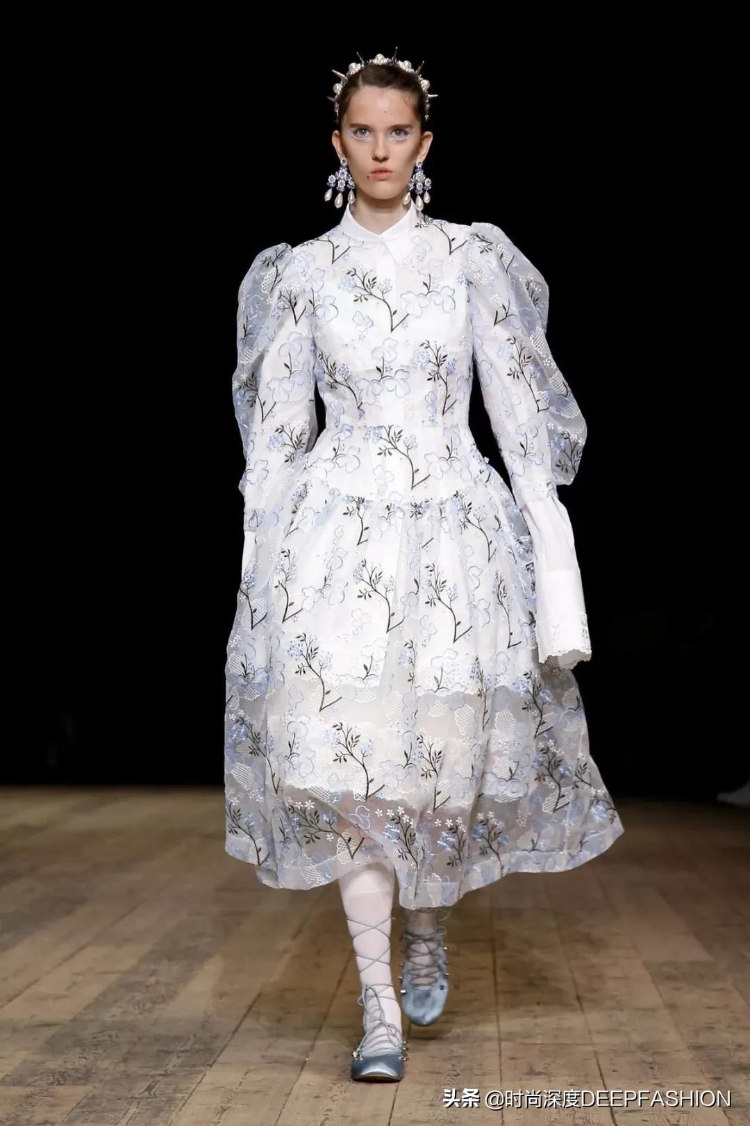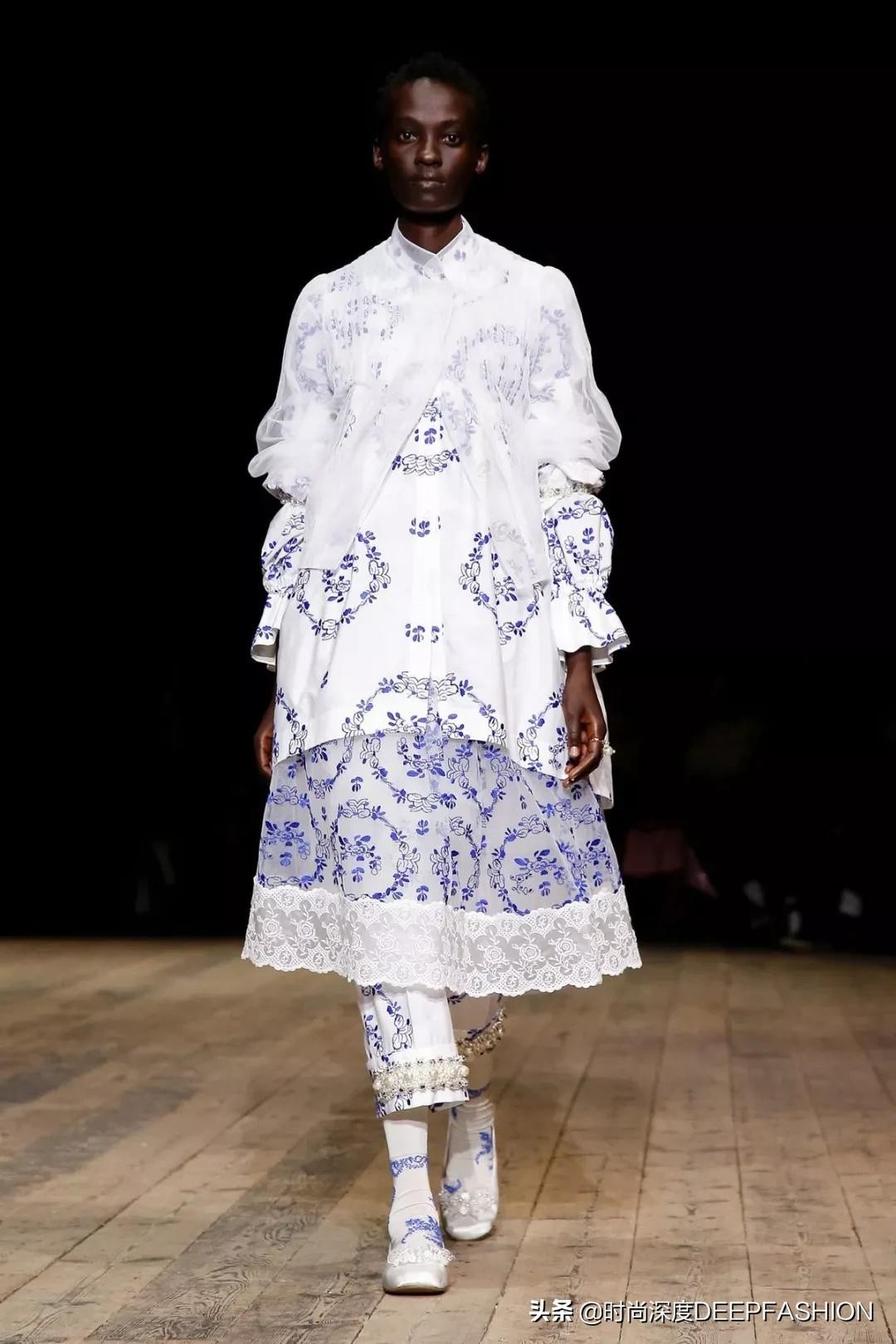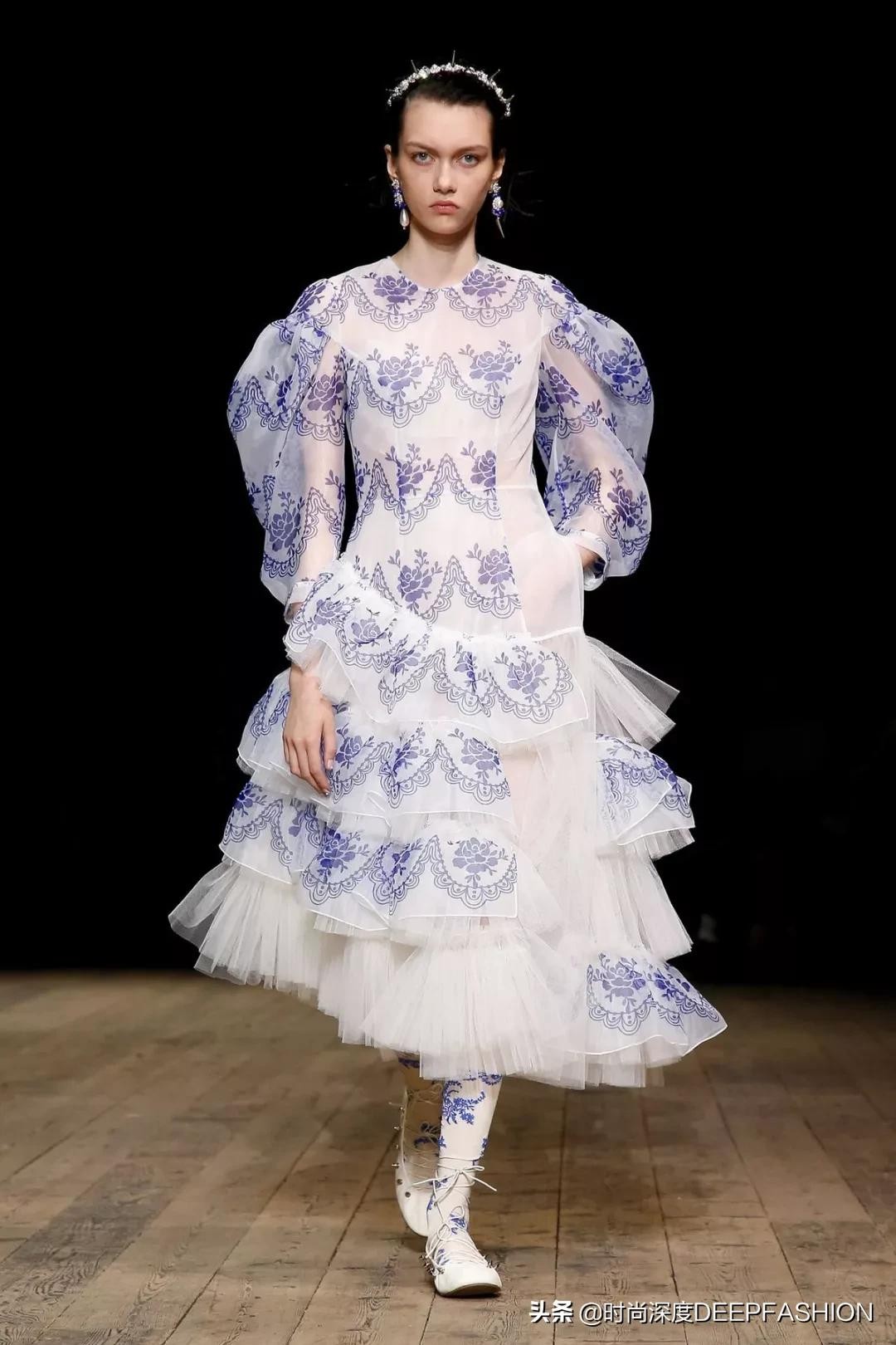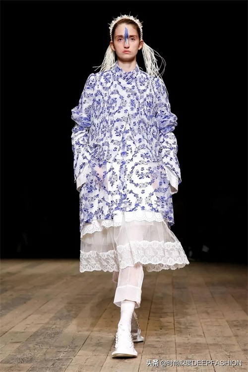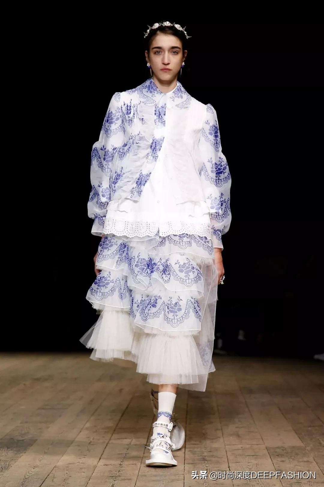 对于SimoneRocha在开场的蓝色印花图案,有别于传统的中式青花瓷图案,本季成衣上异常浓郁的代尔夫特蓝瓷印花,结合了东方韵味与西方审美,展示中西结合的美好,就像Simone Rocha同样流淌着中西结合的血液一样(Simone Rocha父亲John Rocha是一名服装设计师,中葡混血,出生于香港,70年代移居伦敦学习服装设计)。