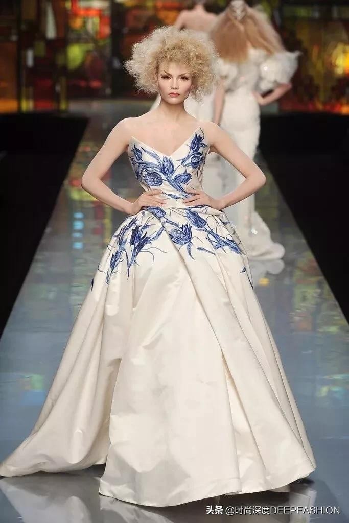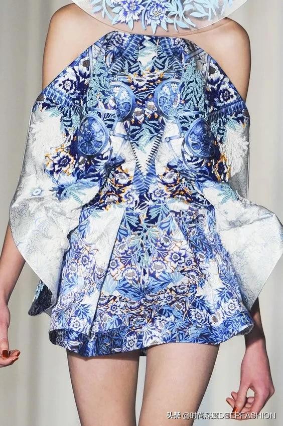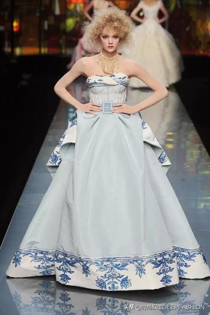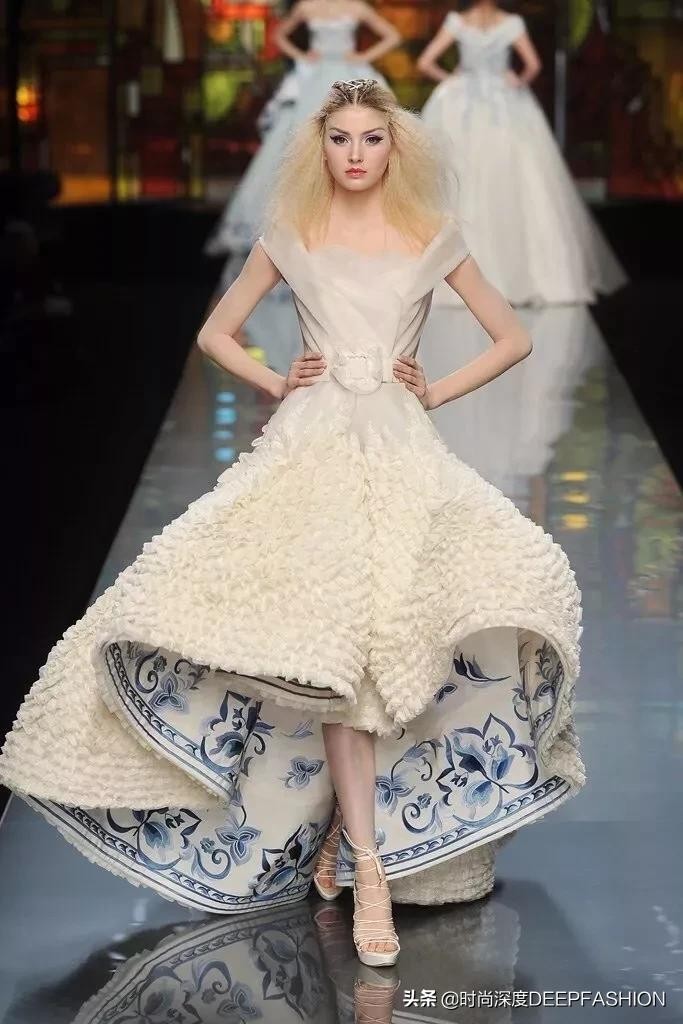John Galliano早在为ChristianDior Spring Summer 2009年的设计中就加入了这一元素,青花瓷的纹样在礼服上的展示欲拒还迎,包藏在裙摆内的纹样仿佛想让你看到,又期待你发现它的样子。