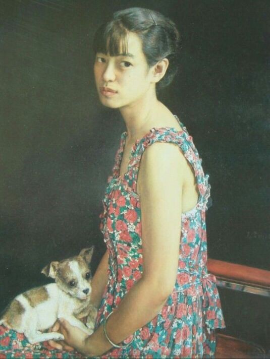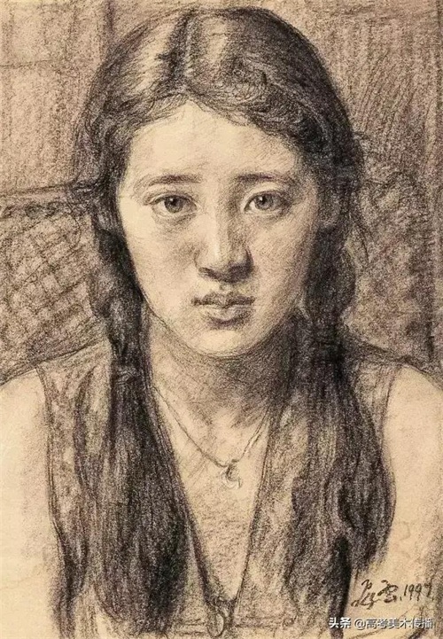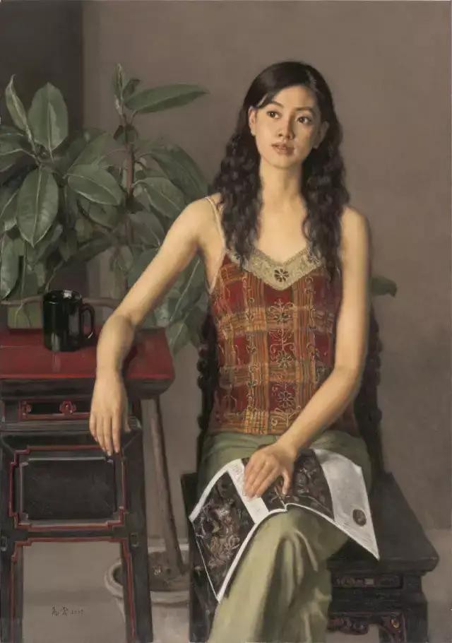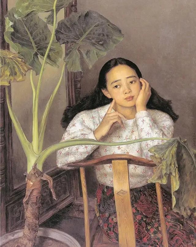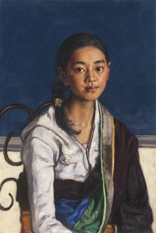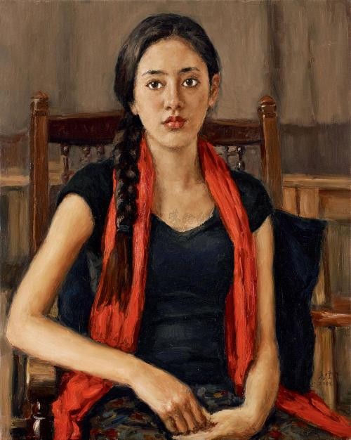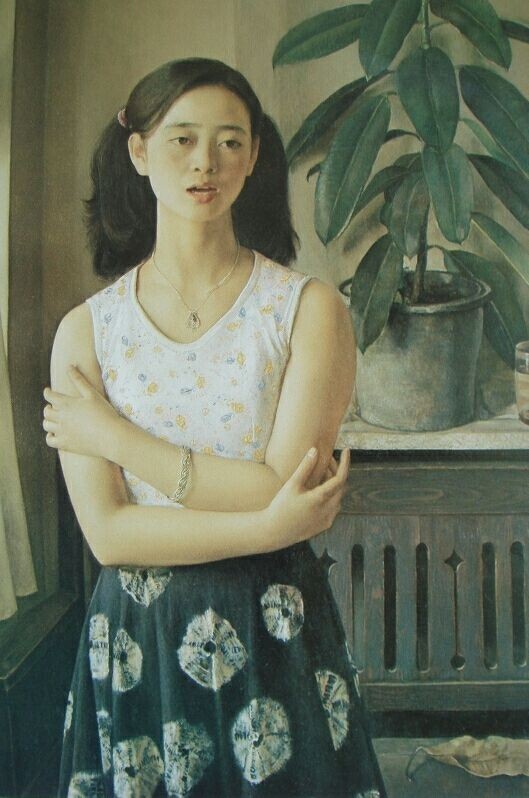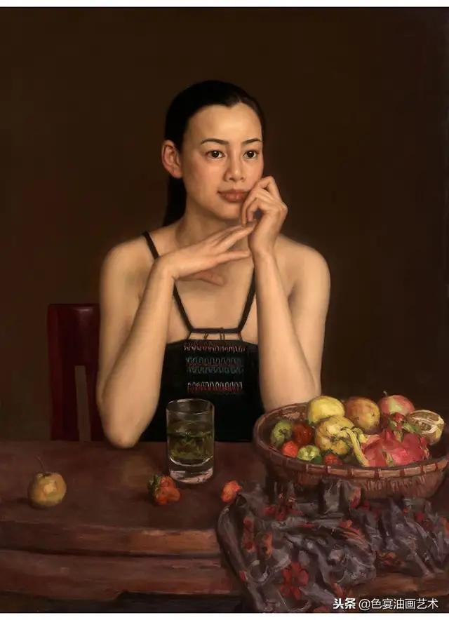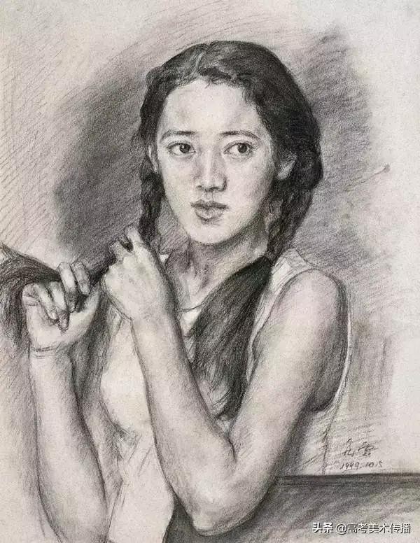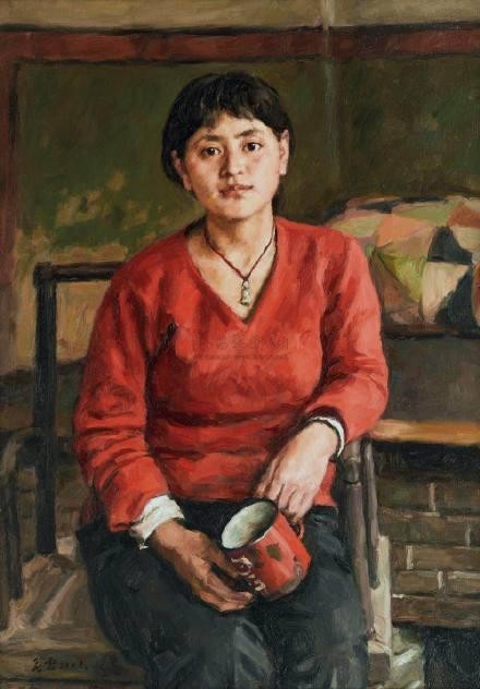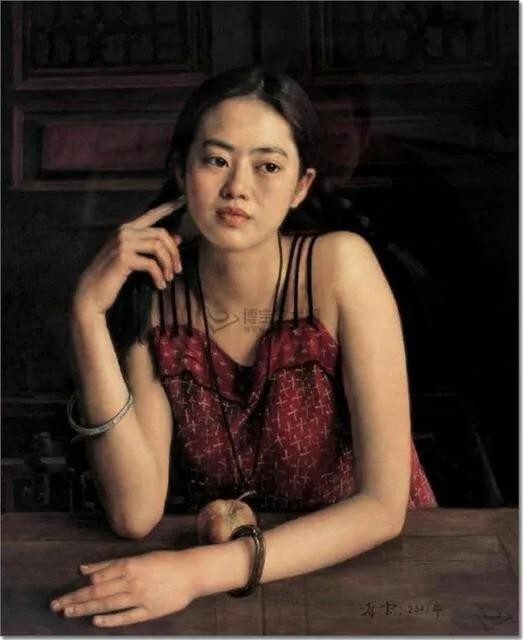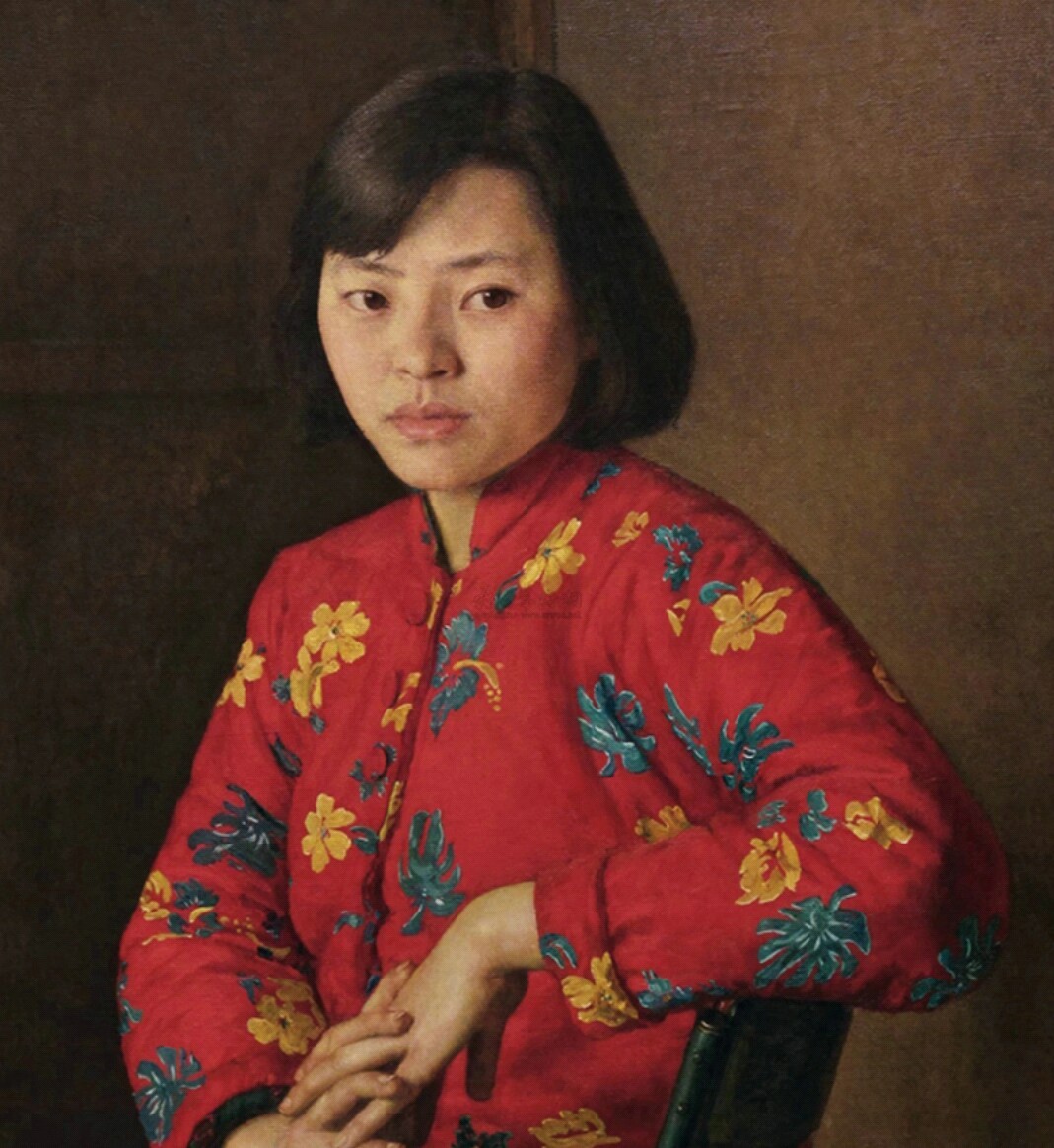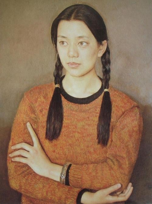 杨飞云画新娘的这幅作品《静物前的姑娘》并没有画得很唯美,更谈不上时髦。相反,初看觉得还有一点土,把新娘画成了一个乡下小妹的模样。新娘扎着两条又黑又粗的辫子,娇小的身材丰韵紧致,不白皙的肤色还有些泛黄,但正是这样的人物形象才符合那个时代的少女特征。