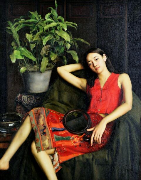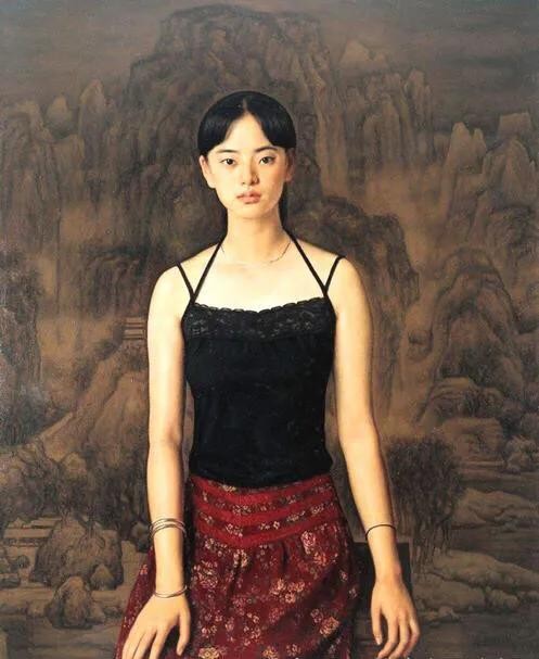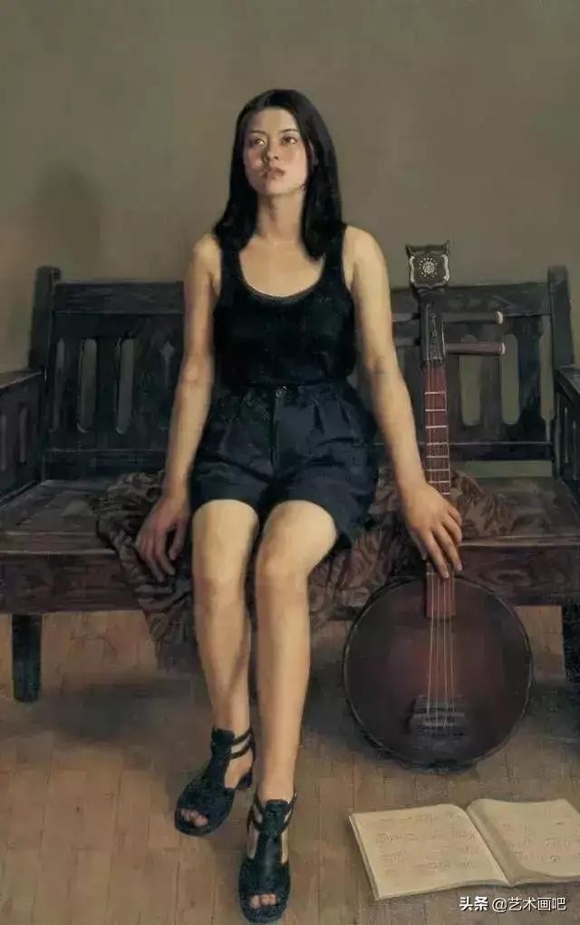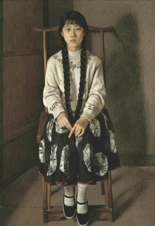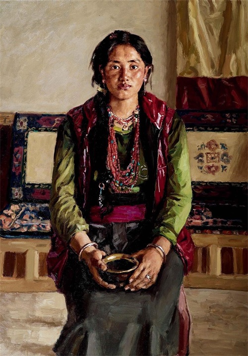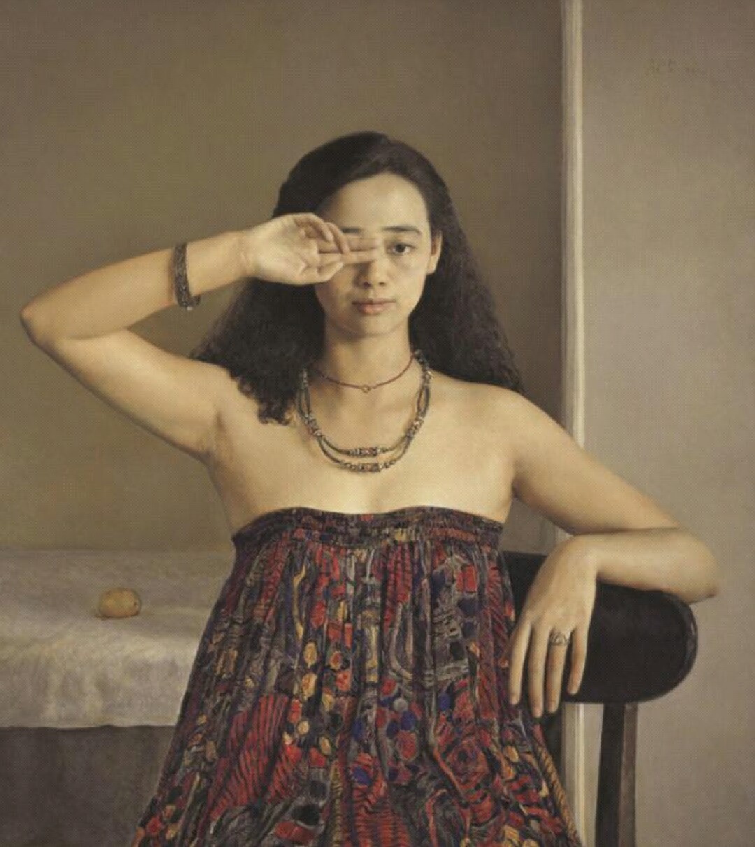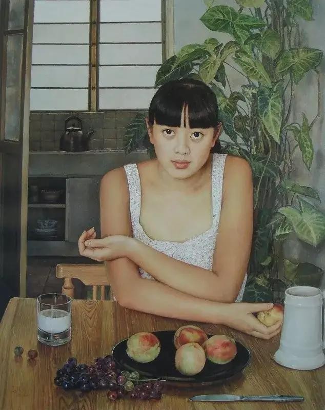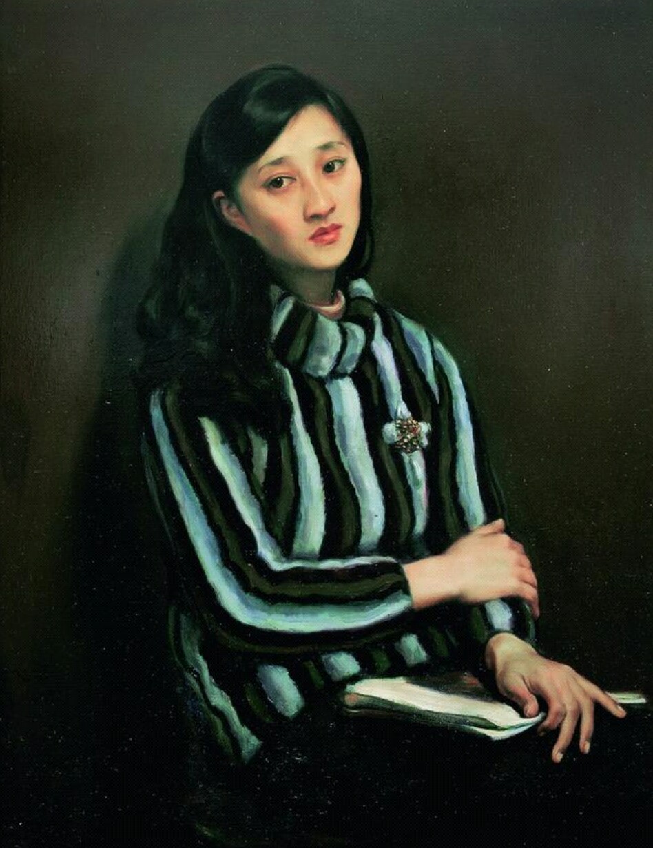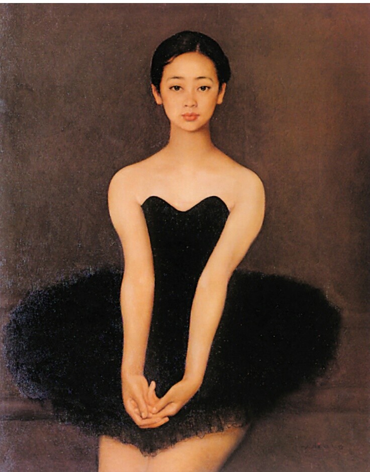 杨飞云画新娘的这幅作品《静物前的姑娘》并没有画得很唯美,更谈不上时髦。相反,初看觉得还有一点土,把新娘画成了一个乡下小妹的模样。新娘扎着两条又黑又粗的辫子,娇小的身材丰韵紧致,不白皙的肤色还有些泛黄,但正是这样的人物形象才符合那个时代的少女特征。
