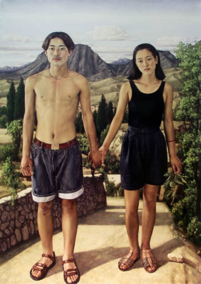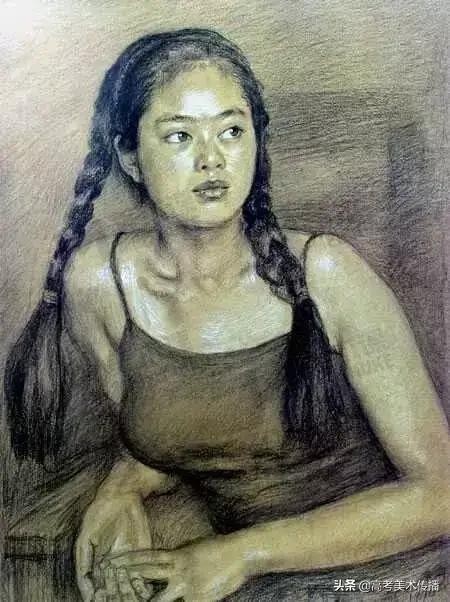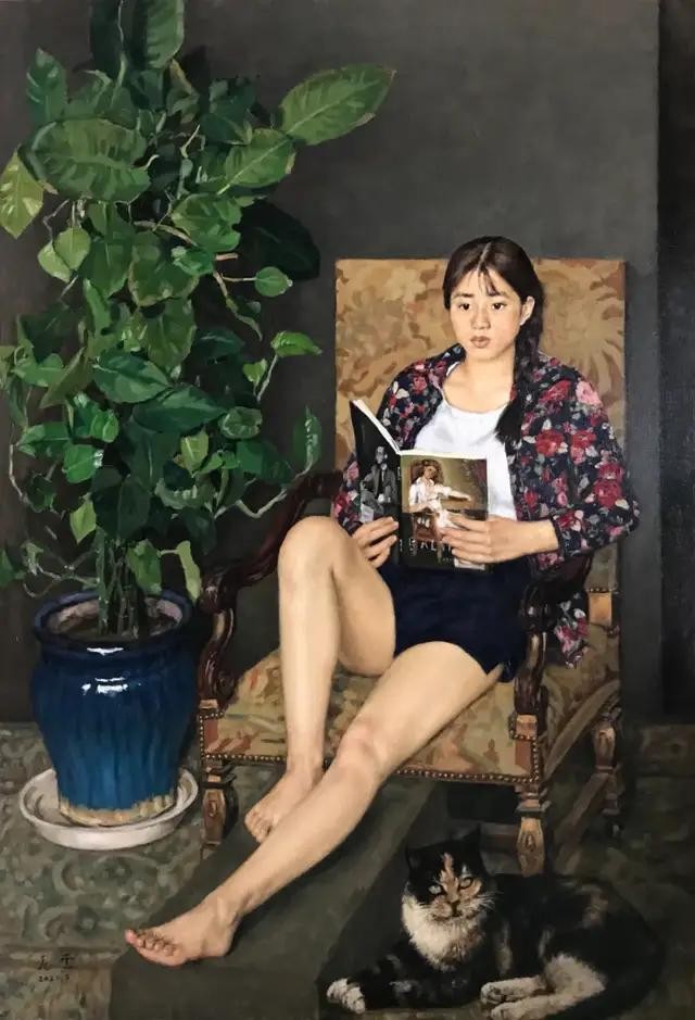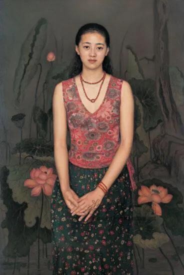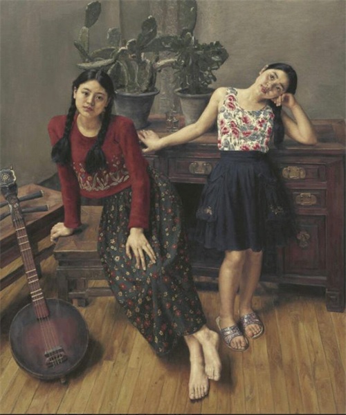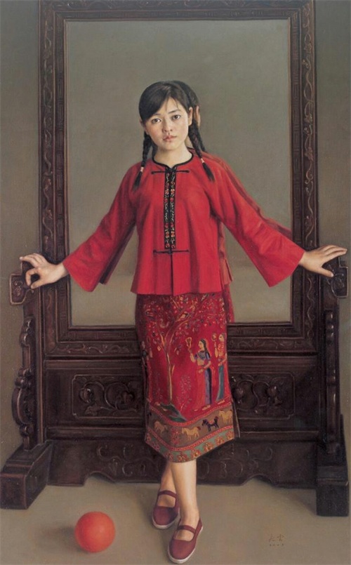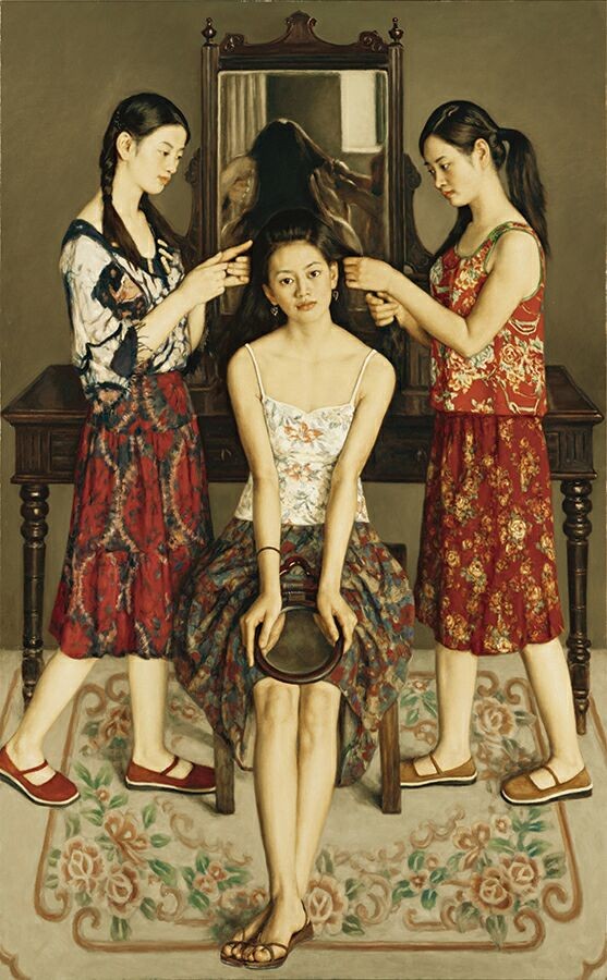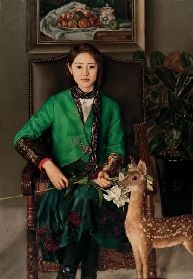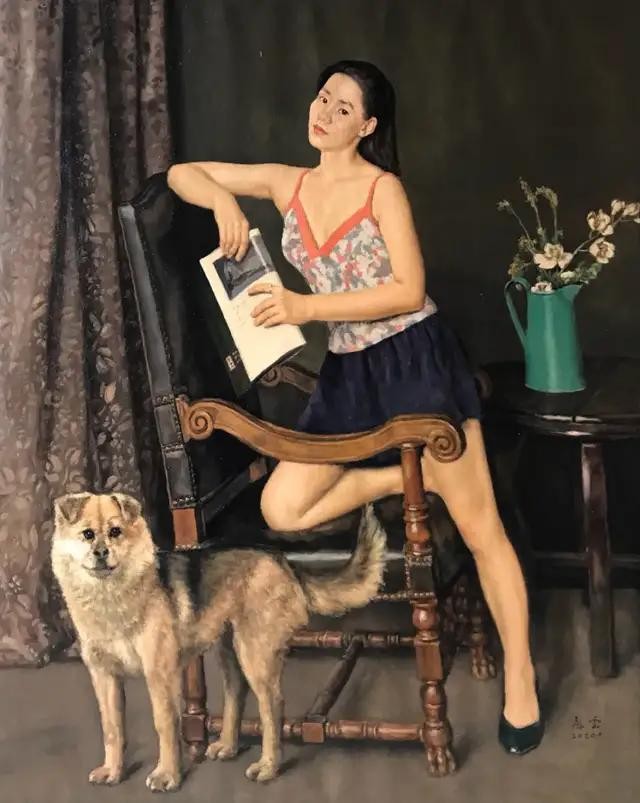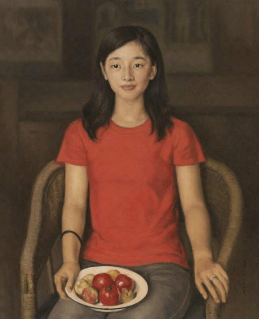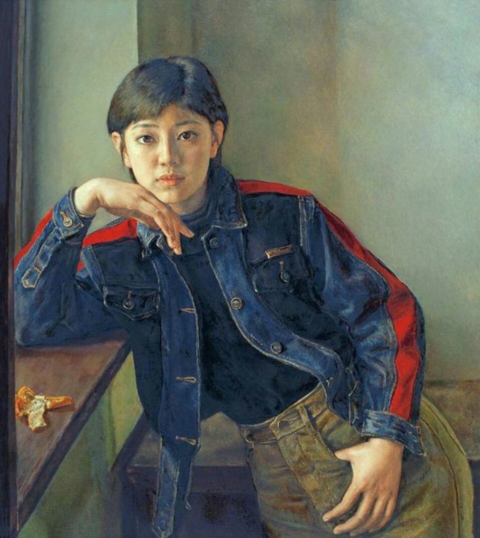 杨飞云画新娘的这幅作品《静物前的姑娘》并没有画得很唯美,更谈不上时髦。相反,初看觉得还有一点土,把新娘画成了一个乡下小妹的模样。新娘扎着两条又黑又粗的辫子,娇小的身材丰韵紧致,不白皙的肤色还有些泛黄,但正是这样的人物形象才符合那个时代的少女特征。