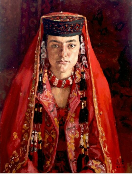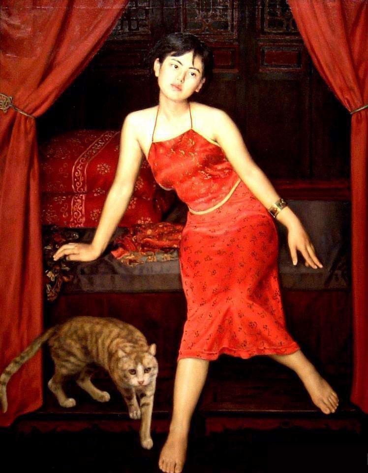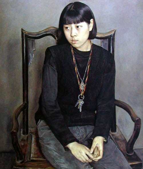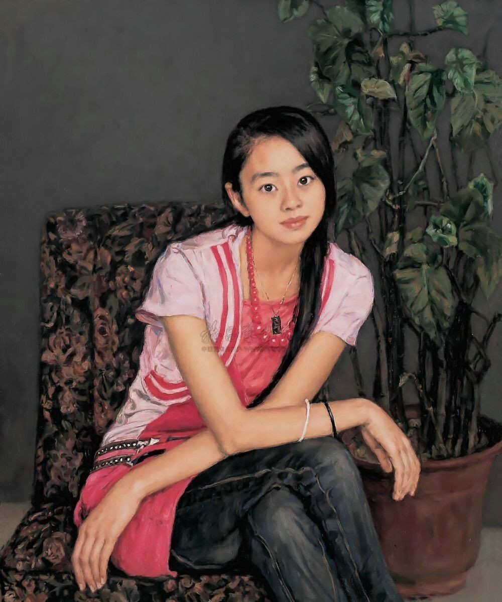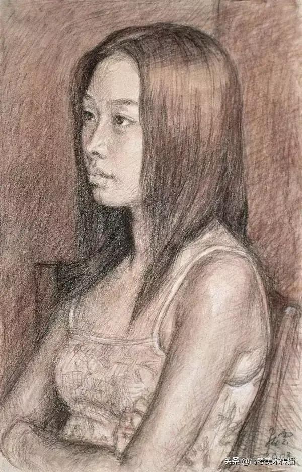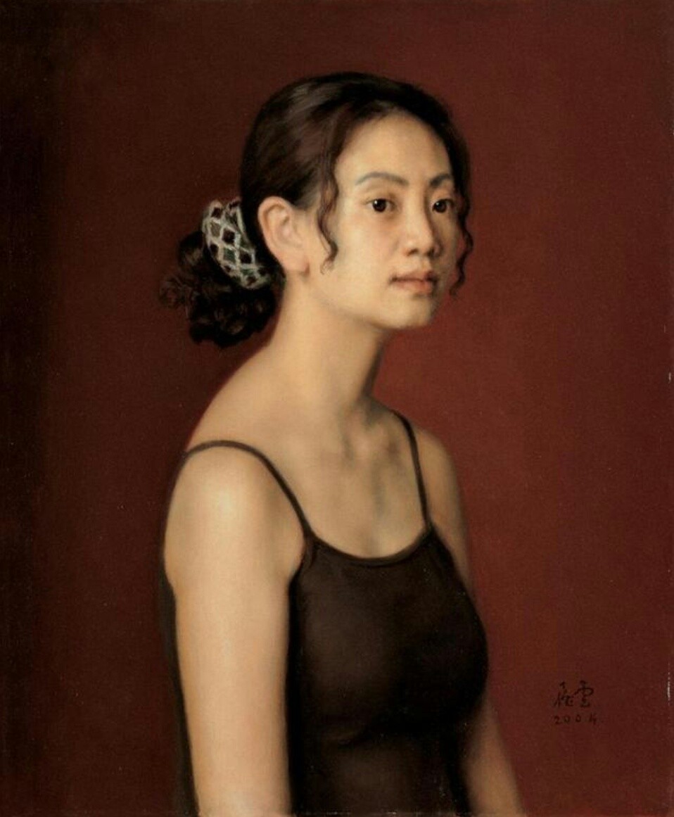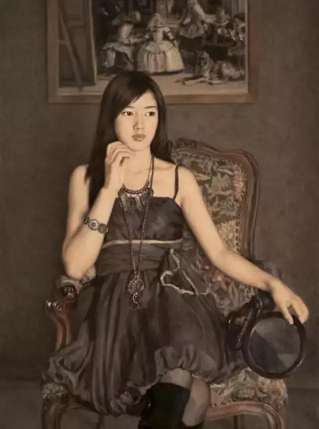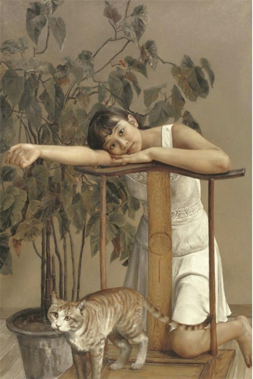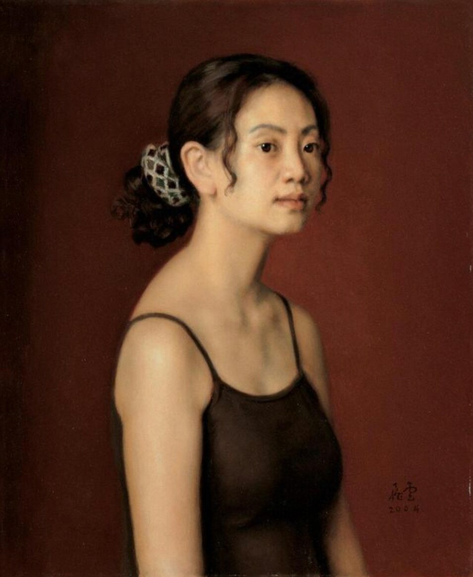 杨飞云画新娘的这幅作品《静物前的姑娘》并没有画得很唯美,更谈不上时髦。相反,初看觉得还有一点土,把新娘画成了一个乡下小妹的模样。新娘扎着两条又黑又粗的辫子,娇小的身材丰韵紧致,不白皙的肤色还有些泛黄,但正是这样的人物形象才符合那个时代的少女特征。