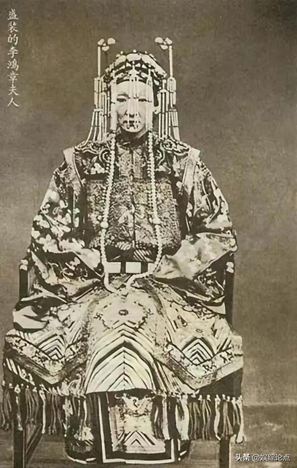 这位穿戴讲究的,是晚清大官李鸿章的老婆。她穿着上朝的衣服,脖子上还挂着朝珠。