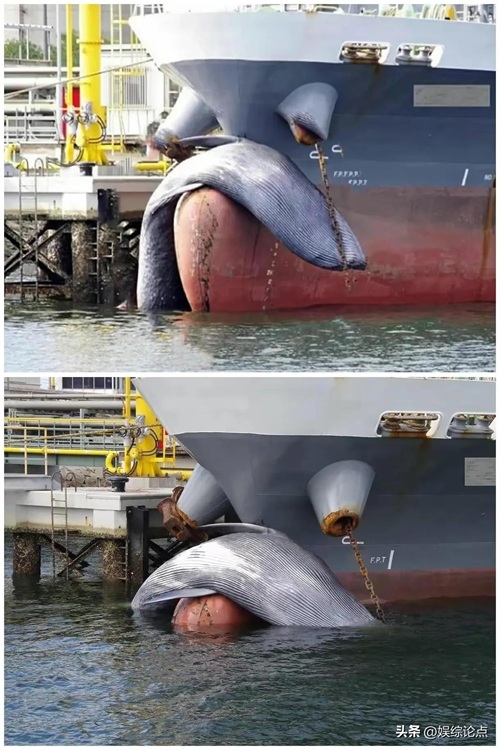 你没看花眼!船头挂着一头长须鲸,已经死了,体长差不多十几米。很多大型船只返航时,都会出现这种误伤大型海洋生物的情况 ,实在太常见了。