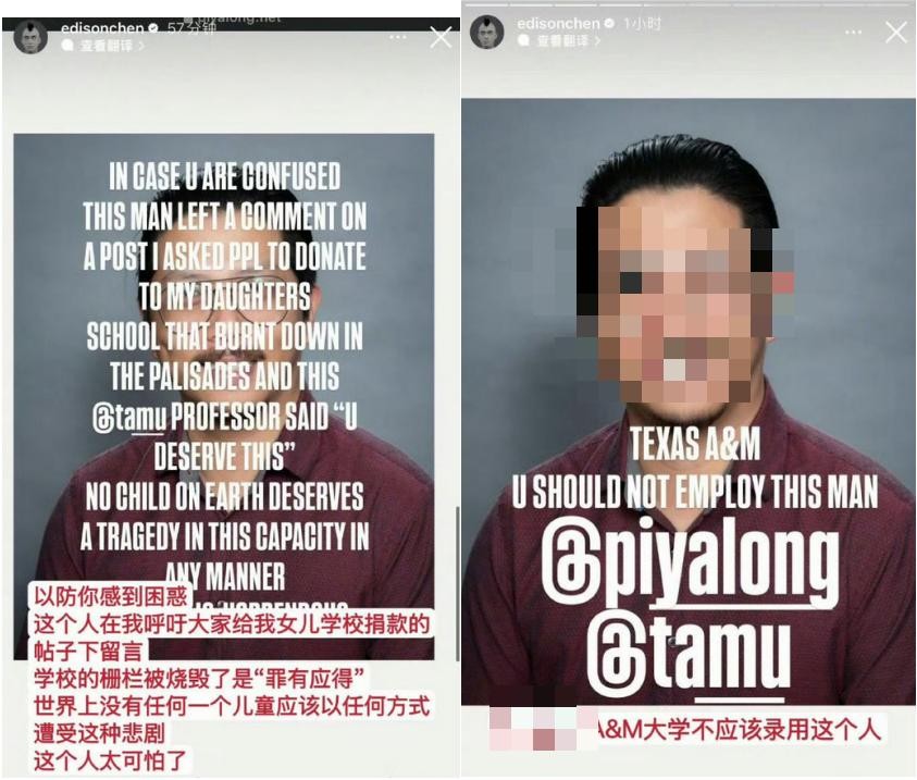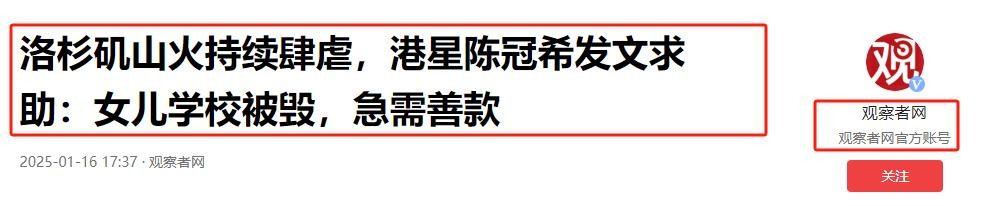 观察者网|洛杉矶山火持续肆虐,港星陈冠希发文求助:女儿学校被毁,急需善款 2025.01.16