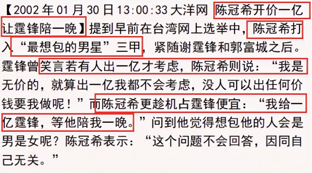 在陈冠希被粉丝选为“最想包的男星”前三甲时,他还会打趣说“我给霆锋一亿,等他陪我一晚上”。