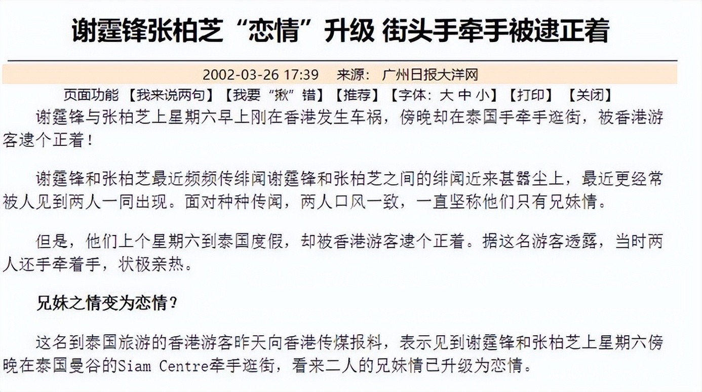 广州大洋日报|谢霆锋张柏芝“恋情”升级 街头手牵手被逮正着 2002.03.26
