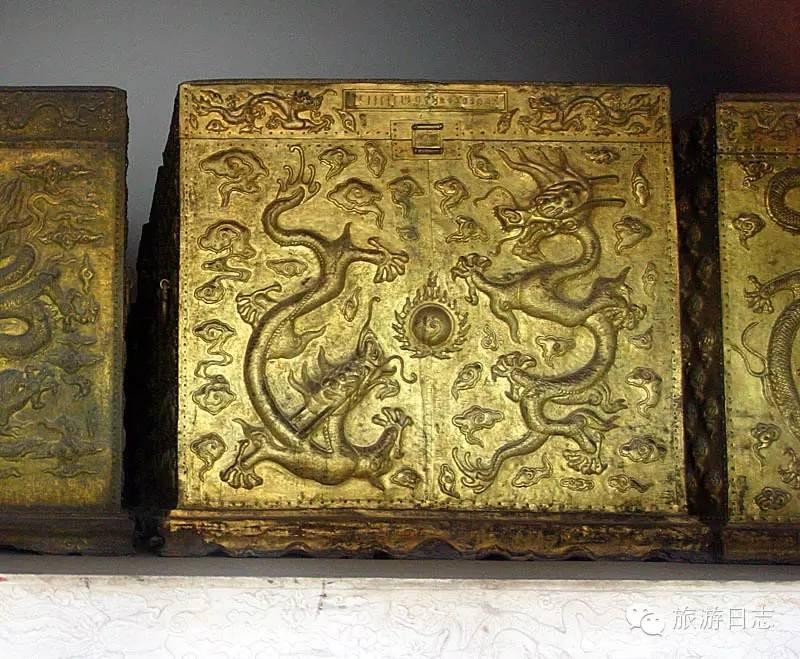 云纹雕龙的木柜,即所谓的“金匮”。在这些“金匮”中,收藏着历朝皇帝的实录和圣训,以及皇室的家谱──玉牒,也就是说皇帝个人和他家族成员的个人资料都收藏在这里了,金匮就是古时候收藏绝密材料的“保险柜”。明朝时《永乐大典》的副本也曾存贮皇史宬。