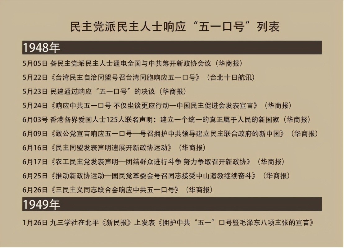 1948年5月5日,李济深、何香凝、沈钧儒、章伯钧、马叙伦、王绍鏊、陈其尤、彭泽民、李章达、蔡廷锴、谭平山、郭沫若12位民主人士联名致电毛泽东和全国同胞,响应中共“五一口号”。