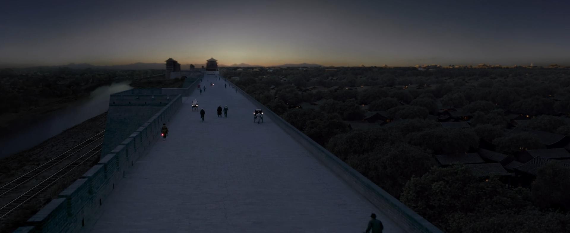 宽大的长城上,蓝青峰和根本一郎会面。画面中,远处的故宫和城墙外的铁路依稀可见,中西文明的交汇这个时候已经无从阻止,只是古老的国家此时还没有完全觉醒,犹如更远处的夕阳,连余晖都是那么有气无力!