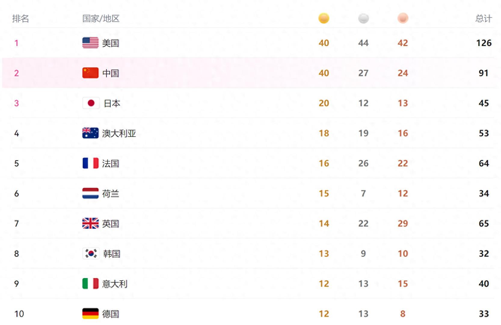 奥运金牌榜“完整”排名:中国44金,从第2变成第1,美国并未登顶