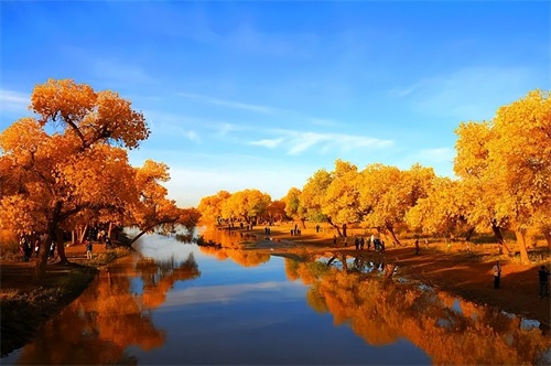额济纳以胡杨林景区闻名于世,额济纳胡杨林是世界三大胡杨林之一,每到秋季时节,额济纳就成了金色的海洋。额济纳胡杨林从每年的9月中旬开始变黄,9月底至10月上旬左右,是额济纳胡杨林最佳观赏时间,10月初秋风过后,大片胡杨由翠绿转成金黄,与湛蓝的天空,共同筑就了一幅亮丽、神奇的秋色油画,分外夺目灿烂。