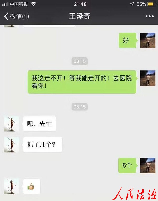 王泽奇对自己的伤情并没有太过在意,在面对前来探望的领导和战友时,他仍然挂念着案件的侦破情况。听到同事告诉他“该团伙5名犯罪嫌疑人全部被抓获,并在现场起获了他们盗窃来的大量财物”时,他才露出开心的笑容,仿佛忘记了伤痛。说起当时的情形,他说:“当时情况紧急,天也黑,坑里情况也不清楚,就想着不能让那小子从我眼前跑了。”