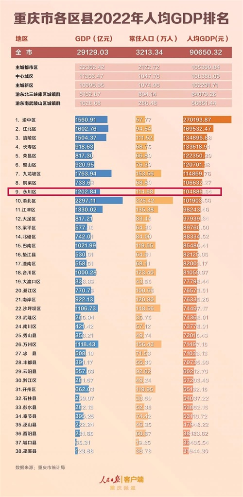 重庆各区县人均GDP情况,渝中区以人均GDP270193.87元位居首位,其次是江北区、涪陵区、长寿区、荣昌区和璧山区,这些区域的人均GDP都在12万元以上。酉阳县、城口县和巫溪县的人均GDP较低,不足4万元。渝东北地区(包括渝中区、江北区、九龙坡区等)和渝东南地区(包括渝中区、江北区、九龙坡区等)的人均GDP与全国平均水平存在一定差距,只有梁平区高于全国平均GDP。