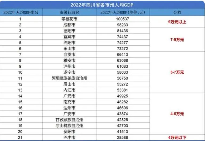四川各地市州GDP情况,人均GDP第一档城市共有攀枝花市、成都市2个,人均GDP均超过9万元。人均GDP第二档城市2022年人均GDP介于7-9万元,德阳市、宜宾市、绵阳市、乐山市。成都平原经济区的几个城市如成都、德阳、绵阳等的人均GDP较高,而川东北地区的城市如广元、南充、广安、达州、巴中等城市的人均GDP则相对较低。