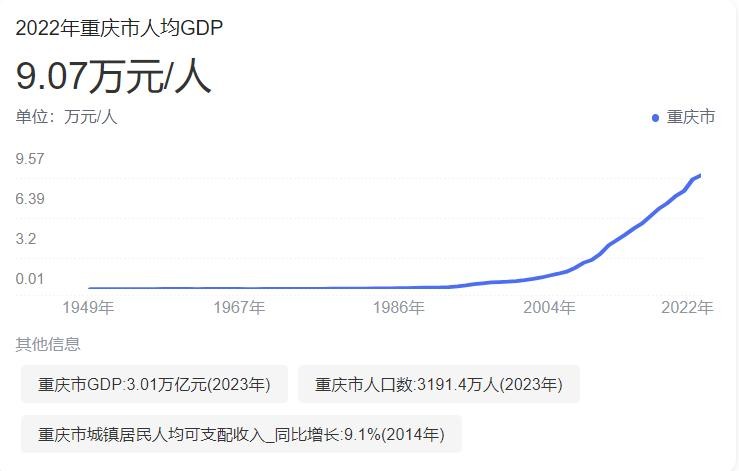 重庆实现地区生产总值30145.79亿元,2022年人均GDP达到9.07万元,2023年超过9.45万元,人均GDP超过四川32%以上。