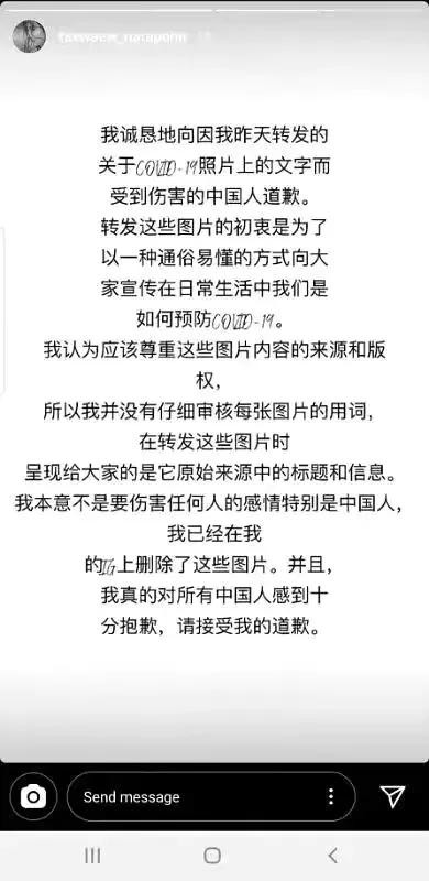 更为重要的是新冠期间她转发数篇关于新冠肺炎的预防时,其中一张带有不当性质的图片写道“The Wuhan Virus”引起中国网友的不满