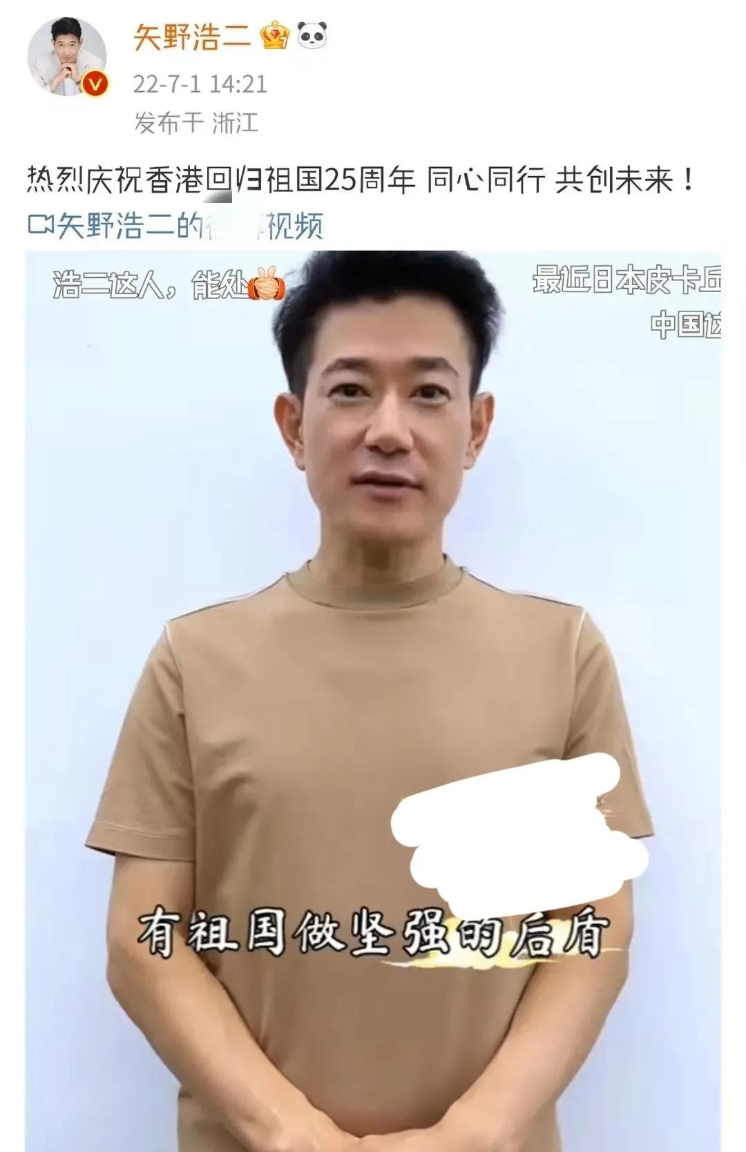 早在今年7月1日,矢野浩二就在社交平台发了一个视频,庆祝香港回归祖国25周年。彼时,也有网友质疑他在蹭热度。当时,底下的留言都是“即便是蹭,也欢迎蹭”。