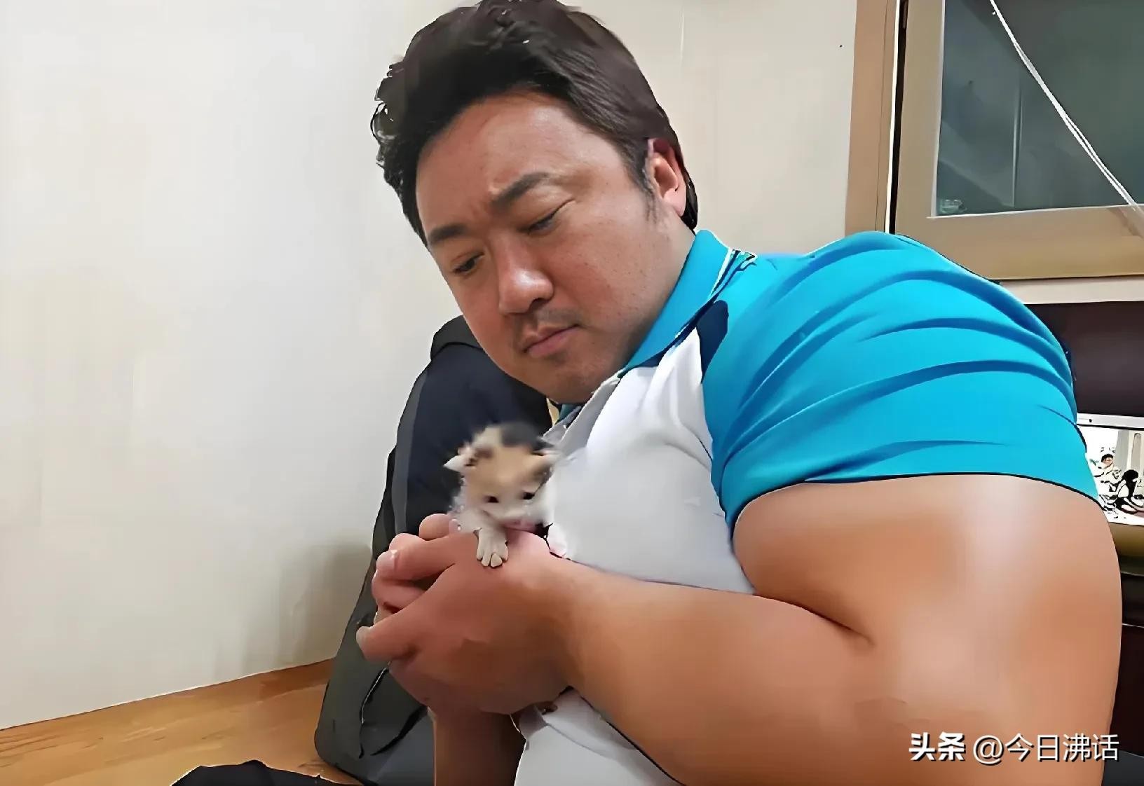 其实,马东锡的肌肉也不是天生的!19岁时他还是个60公斤的“竹竿男”,因常被欺负才发愤健身,一度增重到120公斤,体脂率仅8%。更反差的是,这位“一拳超人大叔”私下竟是“猫奴”,抱小奶猫的照片让网友笑疯:“猫咪在他手里像被缩小灯照过!”