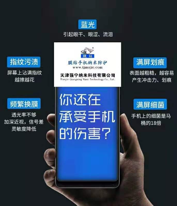 “膜结”手机纳米防护的由来:随着手机功能的增多,使用频率的增长,手机已经成为我们每时每刻都离不开的生活伴侣,不夸张的说人们对手机的依赖超过亲人和朋友!但是手机给我们带来便利的同时也对我们的人身健康带来的伤害也是无法估量的,中国是世界手机大国,就是这一张小小的手机膜不仅影响手感,影响触控灵敏度,影响手机散热,容易折射光线阳光下看手机看不清晰,容易起边翘脚弧度平曲面屏不能完美贴合藏污纳垢很难清理影响手机美观,手机贴膜使用超过三个月滋生细菌的总量是卫生间马桶的十八倍之多,钢化膜易碎容易需要频繁更换,不小心还会伤到人;更严重的是手机贴膜使用严重影响手机屏幕的透光率,现在人们看手机的时间比电视的时间多长,透光率不好眼睛的睫状肌长时间处在紧张疲劳状态,就会出现眼睛干涩累,头晕眼花,视力模糊,久而久之就会导致视力下降及各种眼睛疾病!科学证明手机贴膜使用已经成为眼健康的第一杀手,权威部门报道中国的近视率全世界第一,更为严重的是中国青少年的近视率比例全世界第一!“膜结”手机纳米防护的诞生就是为了取缔钢化膜,让人们每天都能用一个干净透亮,绿色健康的产品,一部健康的手机!