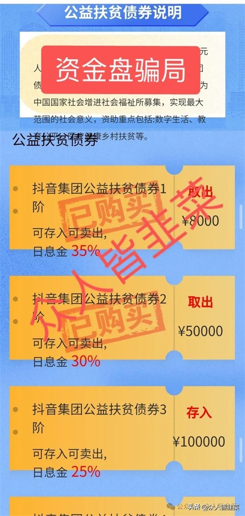 套牌冒充的资金盘骗局,跟抖音没有半点关系,打着冒充抖音的旗号发行的扶贫债券,其实就是资金盘骗局,遇到请赶紧远离。