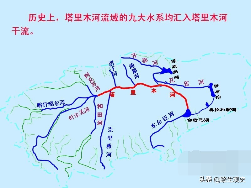 我们现在来看,阿克赛钦对中国来说有多么重要。现在,我们一起来看看一张塔里木河的水系图,就能很直观地看出阿克赛钦对于我国新疆的重要性。