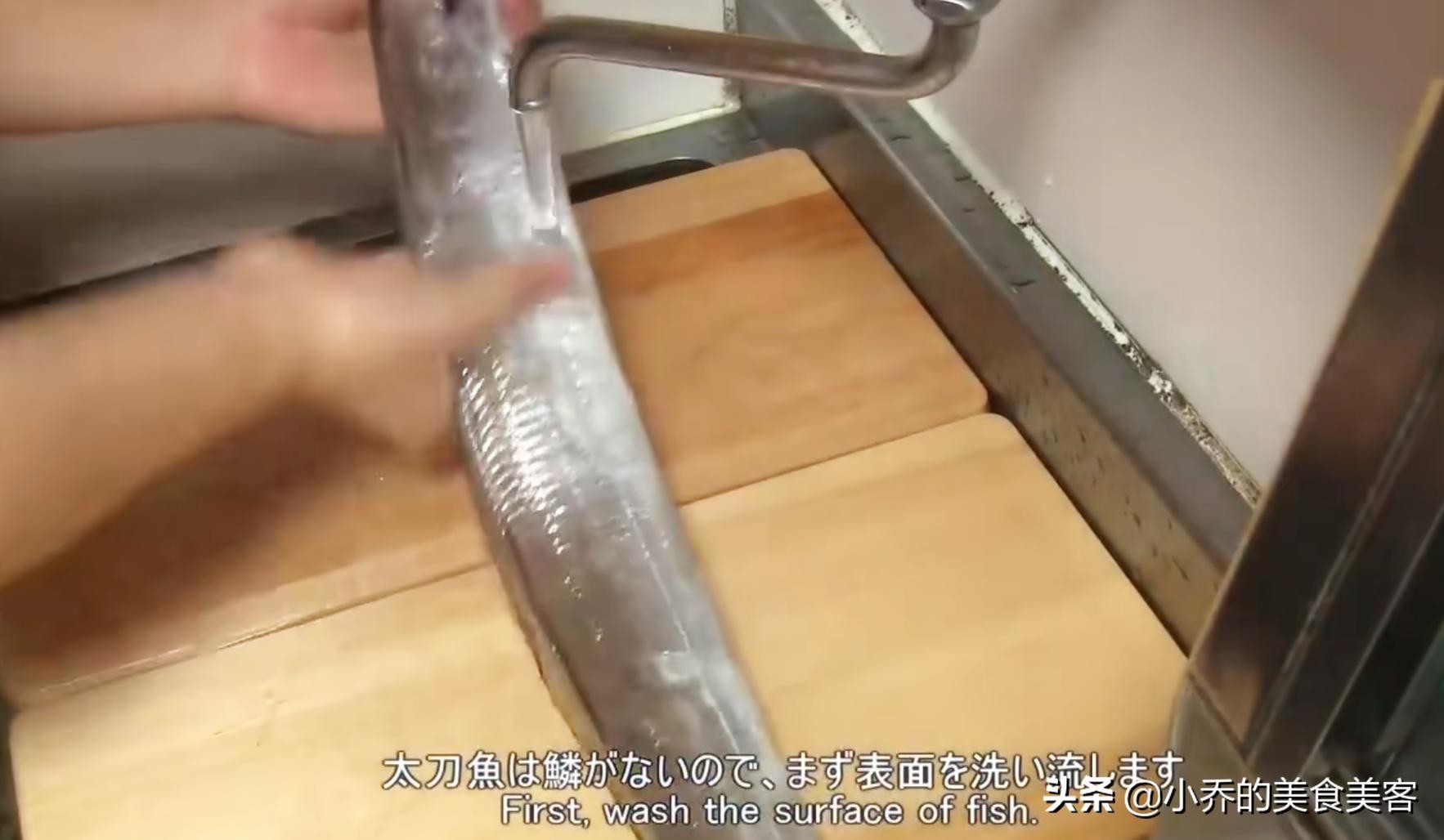 说实话日本人整体比较爱干净,有的人经常爱看关于美食制作的小视频,其中就有很多关于日本料理的,他们的后厨一般都是非常整洁明亮,食材的处理也都是非常干净,在这一点上,粤菜的厨师做得最好。给带鱼去骨之前,日本厨师先是用水反复地将带鱼表皮冲洗干净。