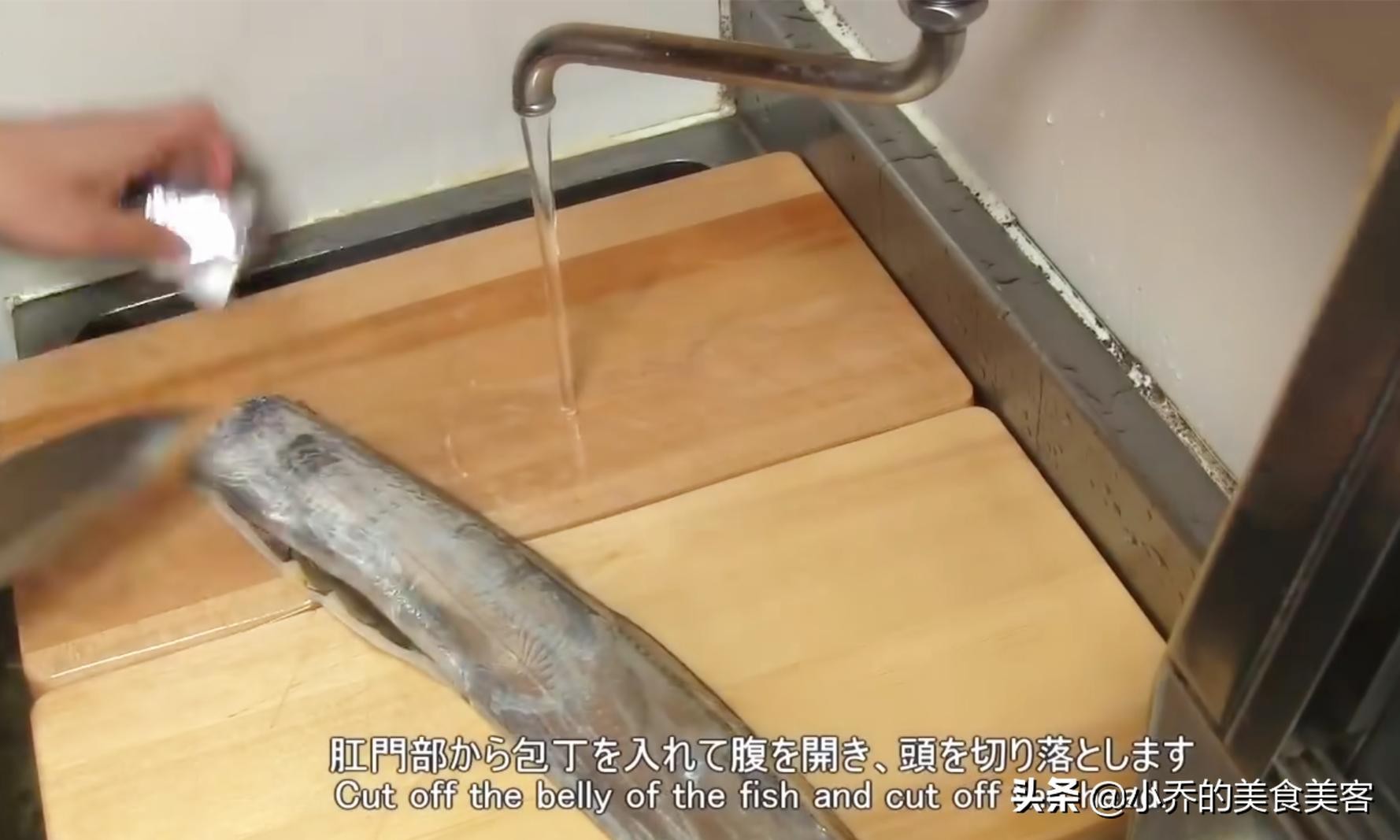 接着就是要去掉带鱼的鱼头,其实关于烹饪的很多技法,只有我们中国人才能做到极致。比如说欧美人的美食,以各种肉类为主,但是仅限于炖肉、煎炸肉排,至于猪蹄子、内脏之类的下脚料,他们是不会懂得怎样去做的。这里说到了鱼头,中国的厨师用鱼头可也加工成很多菜品,不过带鱼的鱼头比较鸡肋,很少有人喜欢吃带鱼的鱼头。这里日本厨师做的是生鱼片,鱼头当然是要切掉的。