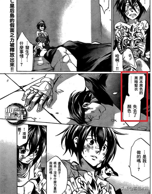就如下图的一辉所说,暗黑首领强戈的实力还不如黑暗四天王,那么他何德何能可以统领暗黑军团呢?恐怕就是改造+修补暗黑圣衣这个独门手艺掌握在历代暗黑军团的首领手里,因为除了天马座、其他四小强的圣衣都是从神话时代起第一次被人获取,之前应该都没人见过,那为何暗黑四天王的圣衣与小强们的圣衣几乎一样形状?这就是因为初代暗黑首领见过小强们的圣衣、照着样子制作的,所以即使暗黑军团中有人实力更强、心里对首领也不服,但为了保证自己的暗黑圣衣遭遇破损后有人修复而选择暂时听命于他,但一辉则完全不同,一辉是实打实地用硬实力让暗黑军团臣服。因此强戈被击倒后,这门手艺从此在暗黑界失传,等暗黑圣衣全部破碎后,暗黑军团也将绝迹江湖。