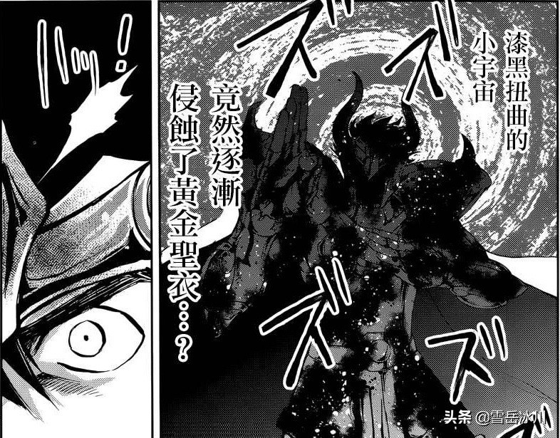 并且在《冥王异传》中山羊座黄金圣衣都有被黑暗侵蚀的迹象(见下图),这说明暗黑圣衣和正常同等级圣衣的原料应该是一样的,只是被暗黑圣斗士的小宇宙给污染了。因此个人推测,制作暗黑圣衣的原料很可能来自于圣衣墓场。