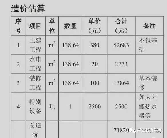 开间8.8米,进深13.1米,采用的二层砖混结构,建筑高度为8.2米,主体造价10万左右,可建双拼,联排。
