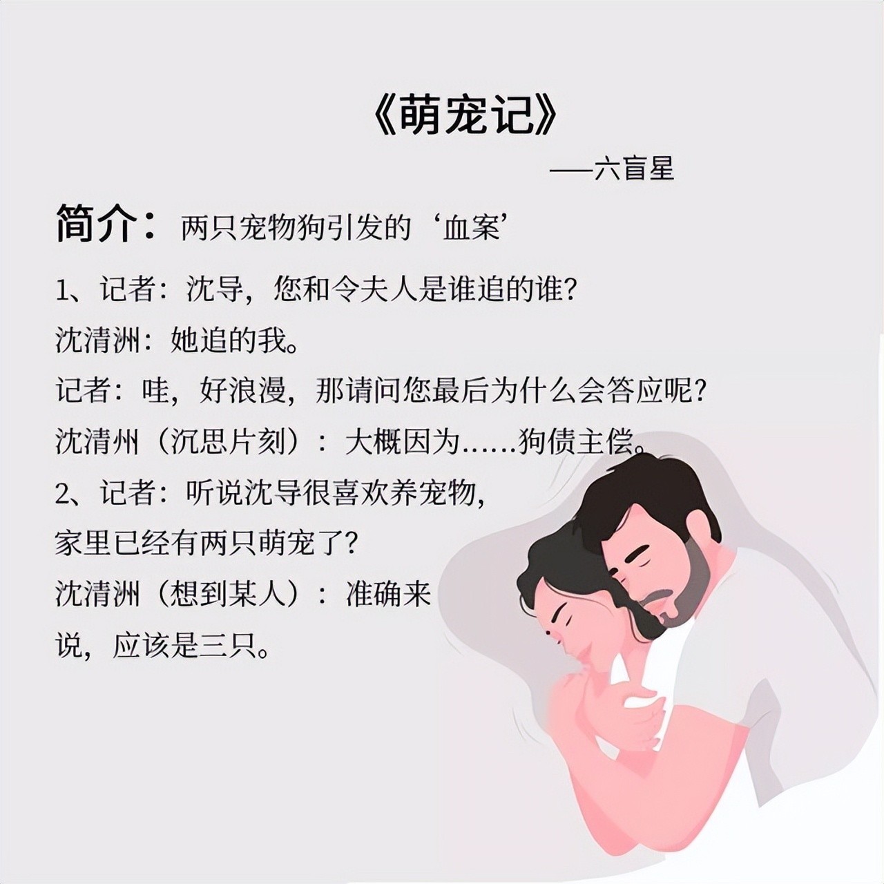 短书评:这是一只狗强上了另一只狗,然后两个狗主人在两只狗的牵线搭桥下成功牵手的故事。高冷禁欲大导演男主x活泼可爱作家女主,人设很讨喜,剧情也比较简单,男女主各自都有些一只萨摩耶,因为两个狗狗的原因互相认识,碰巧又是邻居,初期女主帮男主煮饭照顾狗狗。女主颜控作者一枚,哥哥是大明星,男主是导演禁欲系,遇见女主就破功咯。基本都是从开头甜到结尾系列,副cp是女主闺蜜和她哥哥,青梅竹马,也不错,这一对有一点点小虐。