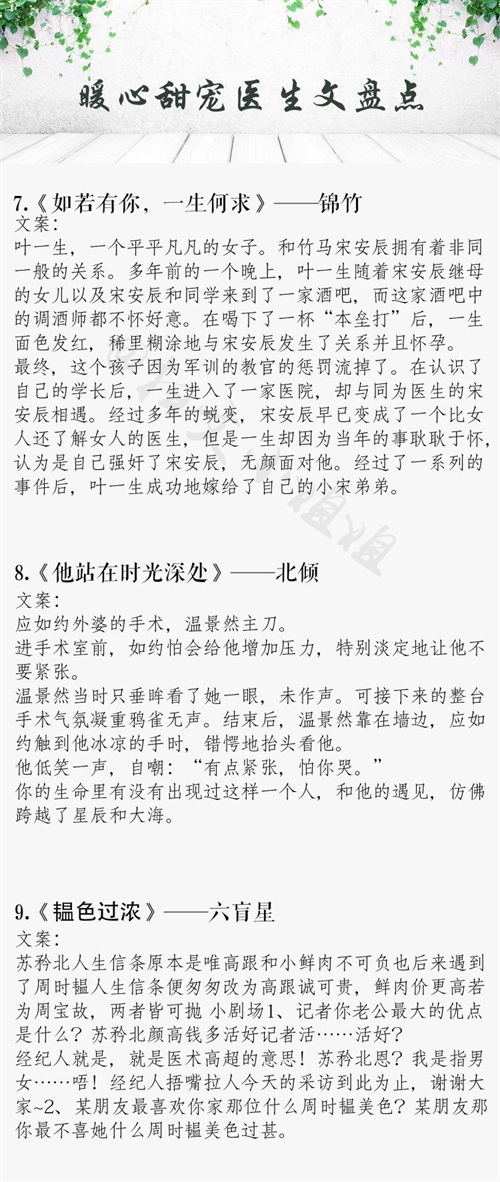 笙离的《爱你,是我做过最好的事》这是我最喜欢的一本医生文,温柔中医男主VS酒店白领女主。男女主都是在分手之后遇见彼此的,在孤独的他乡相互温暖。他们的爱情让人暖心,文中穿插的中药更有滋味。每当看到温润的何苏叶,都让我有种内心很宁静的感觉。作者写得很好,也让我感受到了我们中医的魅力。一篇很温暖的文,全文无狗血,就是两个平凡人相识,互相温暖,互相治愈的文,喜欢男女主细水长流的爱情,在这篇文里你可以找到一种平凡的温暖,喜欢这种爱情的宝宝可食用。