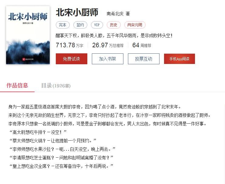 这本书主要讲一个叫李奇厨艺大师因为在新婚之夜喝醉直接穿越到了北宋,无奈之下抄起了老本行,在汴京一家即将贱卖的酒楼做起了厨师的故事。