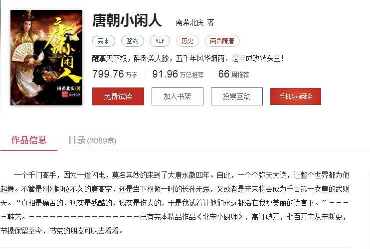 我当时受朋友推荐,看了他的北宋小厨师,看完之后,立马就看到这货新出了一本唐朝小闲人。虽然还在更新,也是立马就开始跟书。感觉这哥们起书名就一个套路。虽然书名和情节都过于套路,但是这本书还是写出了不一样的意思。水平和北宋小厨师持平,值得一看。
